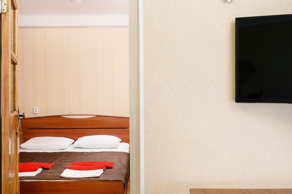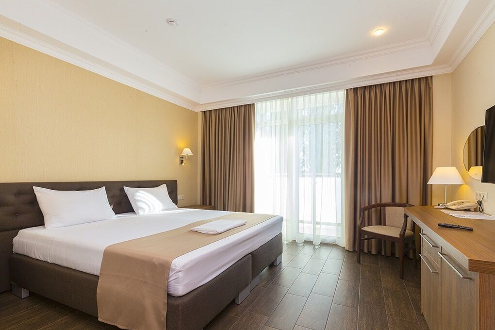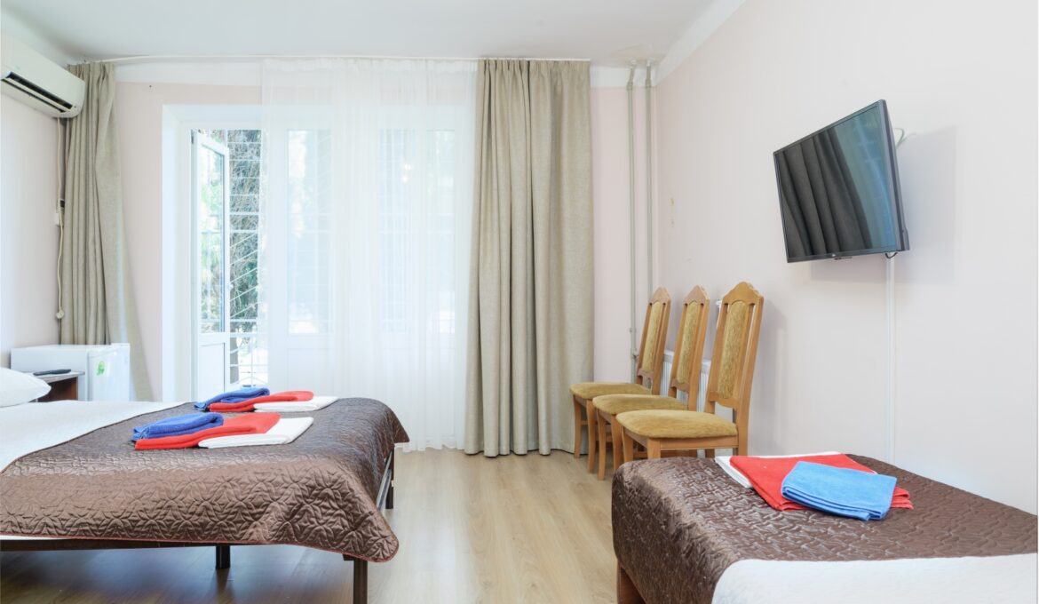 - 2-местный 1-комнатный Стандарт. Площадь: 14 кв.м. В номере: две односпальные кровати или одна двуспальная кровать, кондиционер, телевизор, холодильник, чайник с набором посуды, санузел с душем, фен. Балкон с видом на парковую зону. Дополнительное место - еврораскладушка.