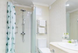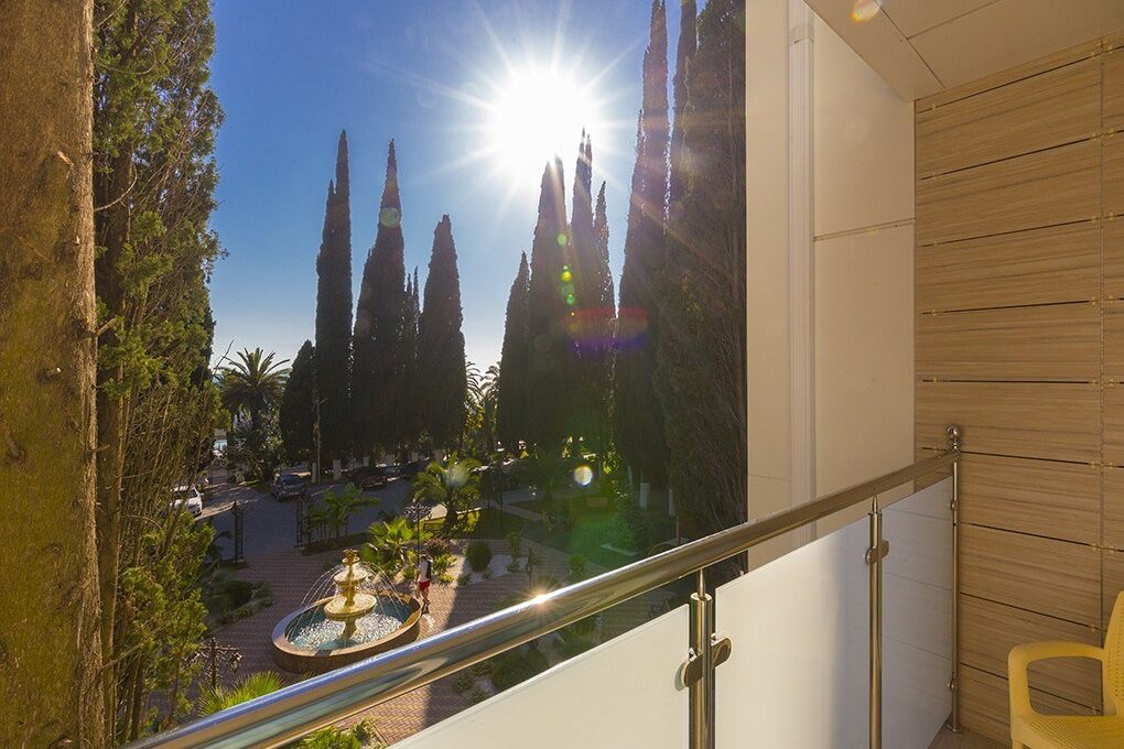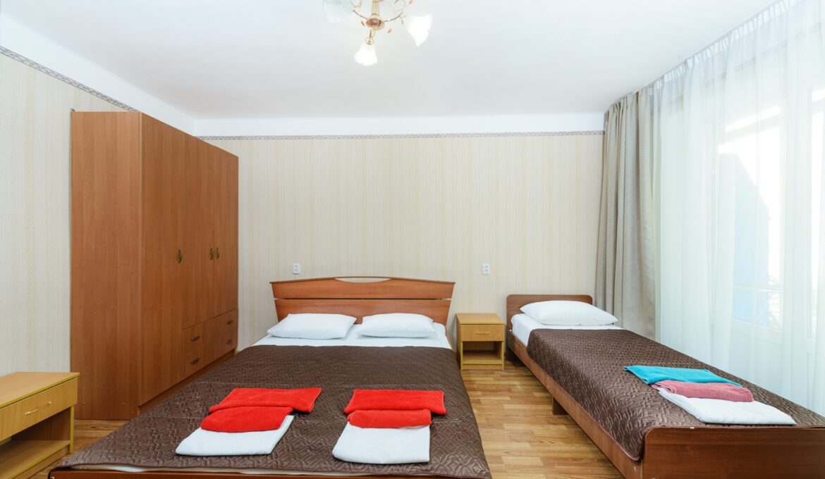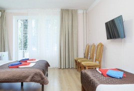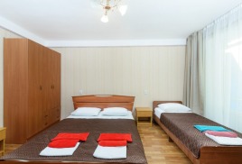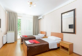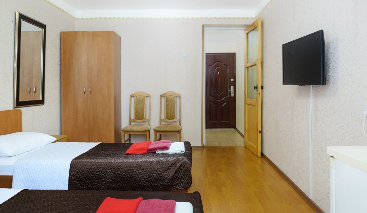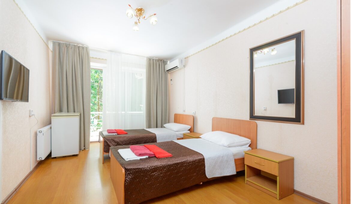 - 3-местный 1-комнатный Стандарт. Площадь: 16 кв.м. В номере: три односпальные кровати или одна двуспальная кровать и одна односпальная кровать, кондиционер, телевизор, холодильник, чайник с набором посуды, санузел с душем, фен. Балкон с видом на парковую зону (фонтан). Дополнительное место - еврораскладушка.