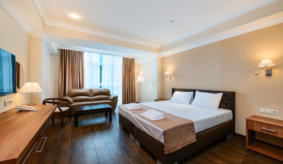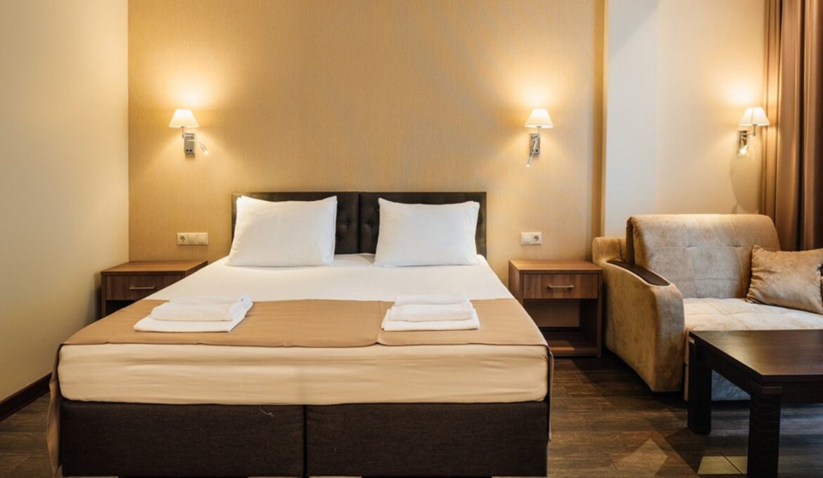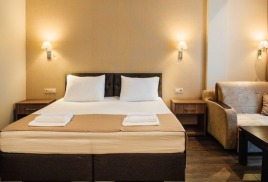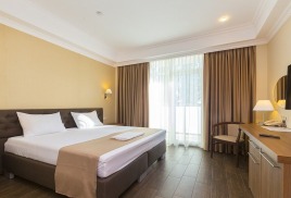 - 2-местный 1-комнатный Студия категория с балконом Площадь: 25 кв.м. В номере: две односпальные кровати или одна двуспальная кровать, диван, кондиционер, телевизор, холодильник, чайник с набором посуды, сейф, санузел с душем, фен. Балкон с видом на горы.