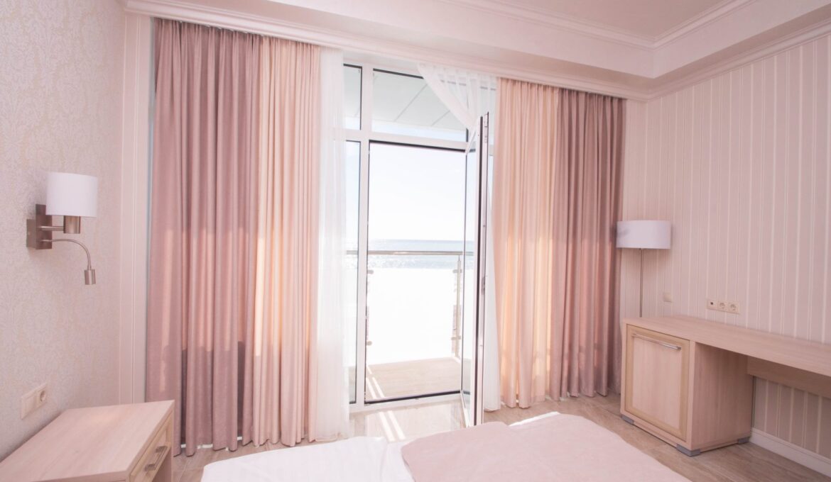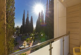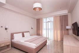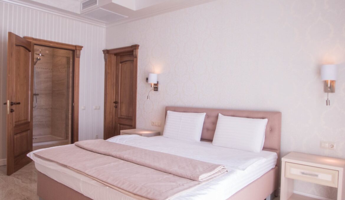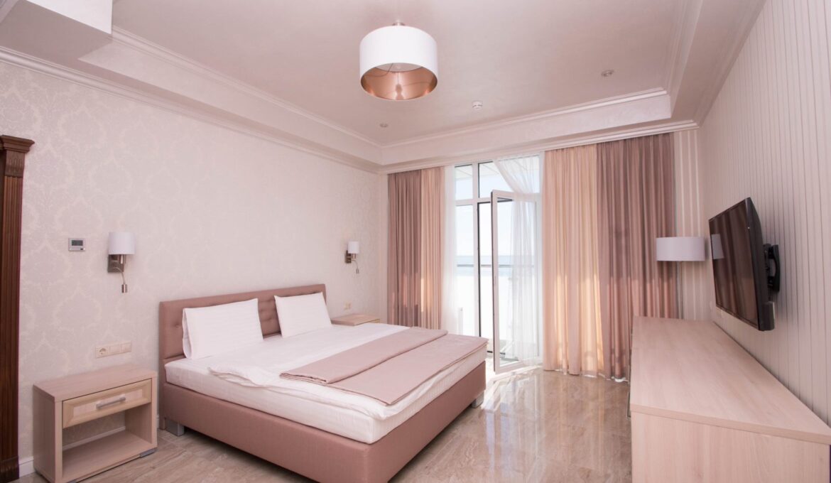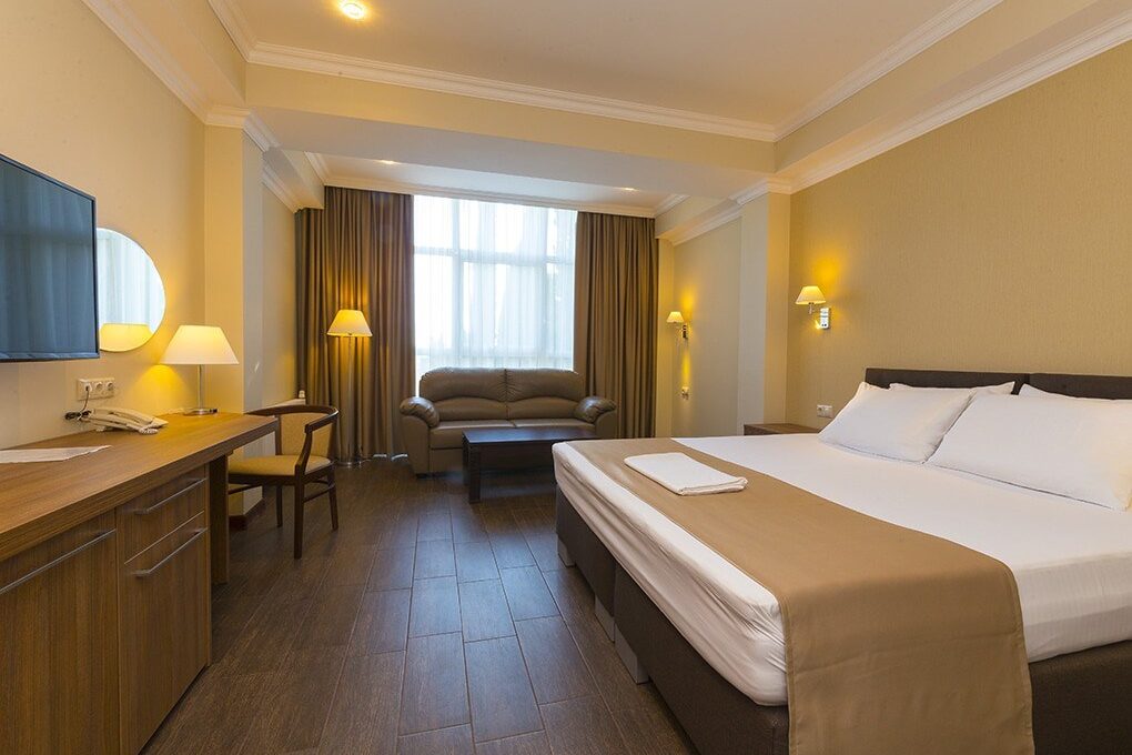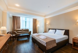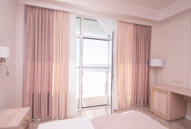 - 2-местный 2-комнатный Люкс. Площадь: 27 кв.м. В номере: спалья с двуспальной кроватью, гостиная с мягкой мебелью, кондиционер, телевизор, холодильник, чайник с набором посуды, сейф, санузел с душем, фен. Балкон с видом на море.