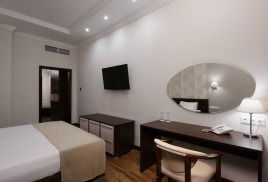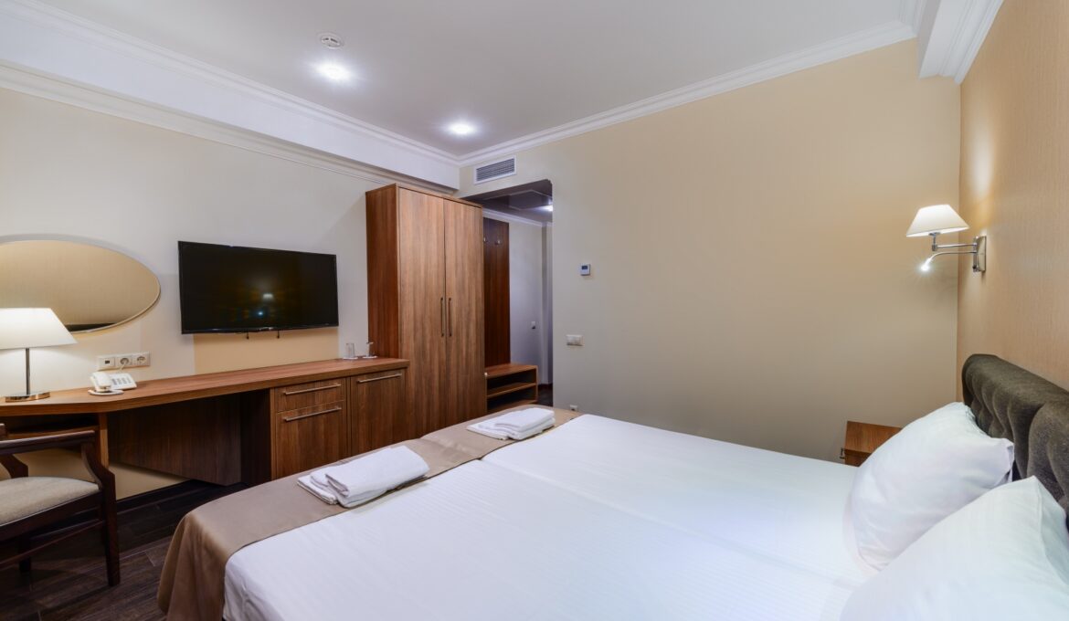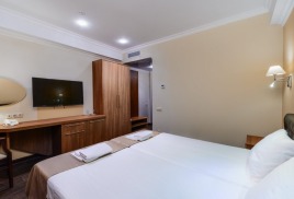 - 2-местный 1-комнатный Стандарт без балкона. Площадь: 18 кв.м. В номере:две односпальные кровати или одна двуспальная кровать, кондиционер, телевизор, холодильник, чайник с набором посуды, сейф, санузел с душем, фен. Номер без балкона с видом на горы и город.