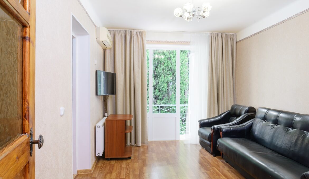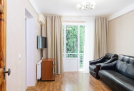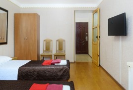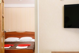 - 3-местный 2-комнатный Стандарт. Площадь: 25 кв.м. В номере: спальня с двуспальной кроватью, гостиная с мягкой мебелью (диван не раскладывается), односпальная кровать, кондиционер, телевизор, холодильник, чайник с набором посуды, санузел с душем, фен. Балкон с видом на парковую зону (фонтан).