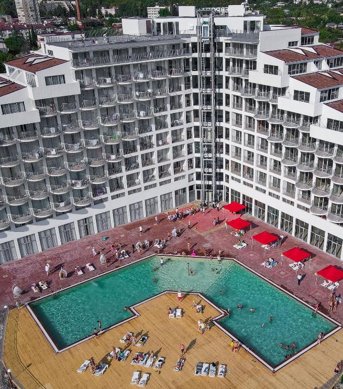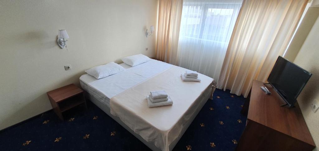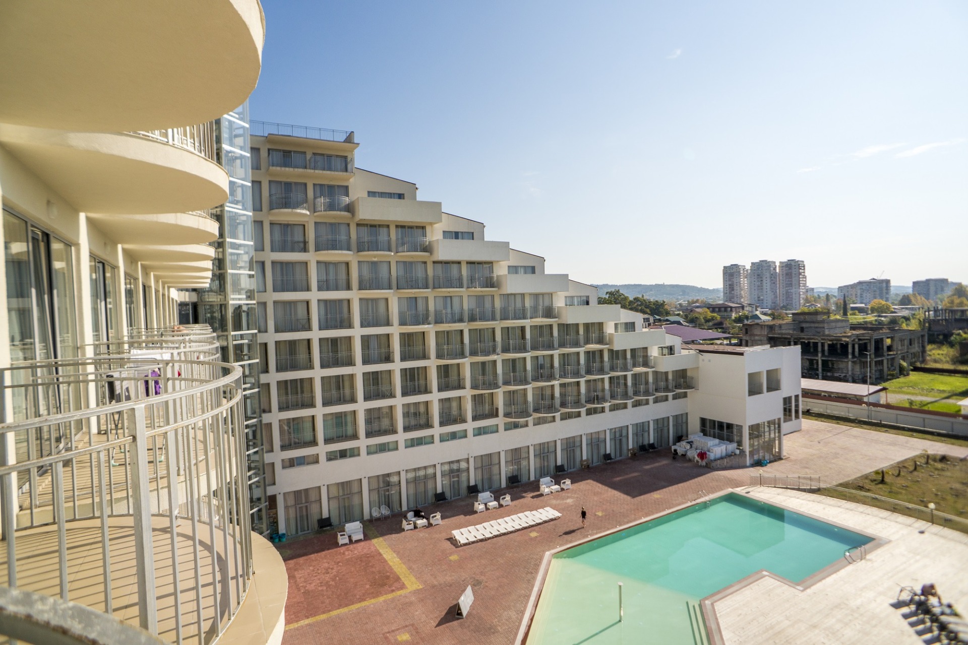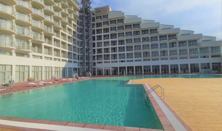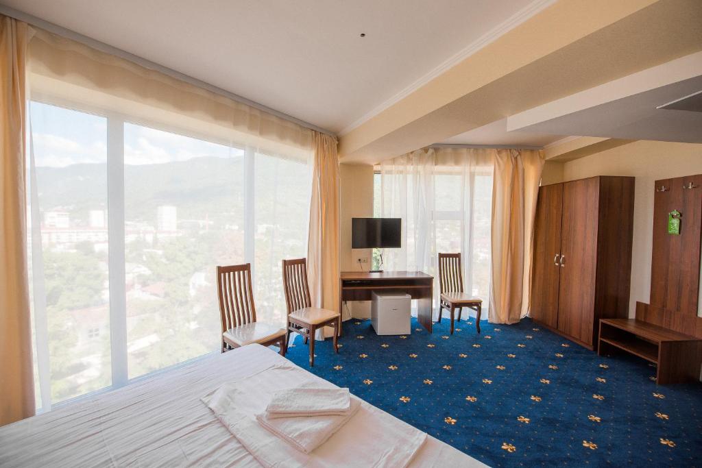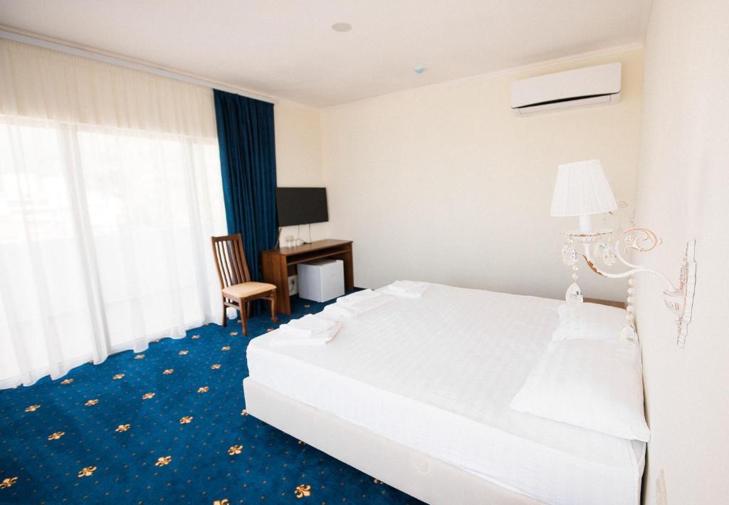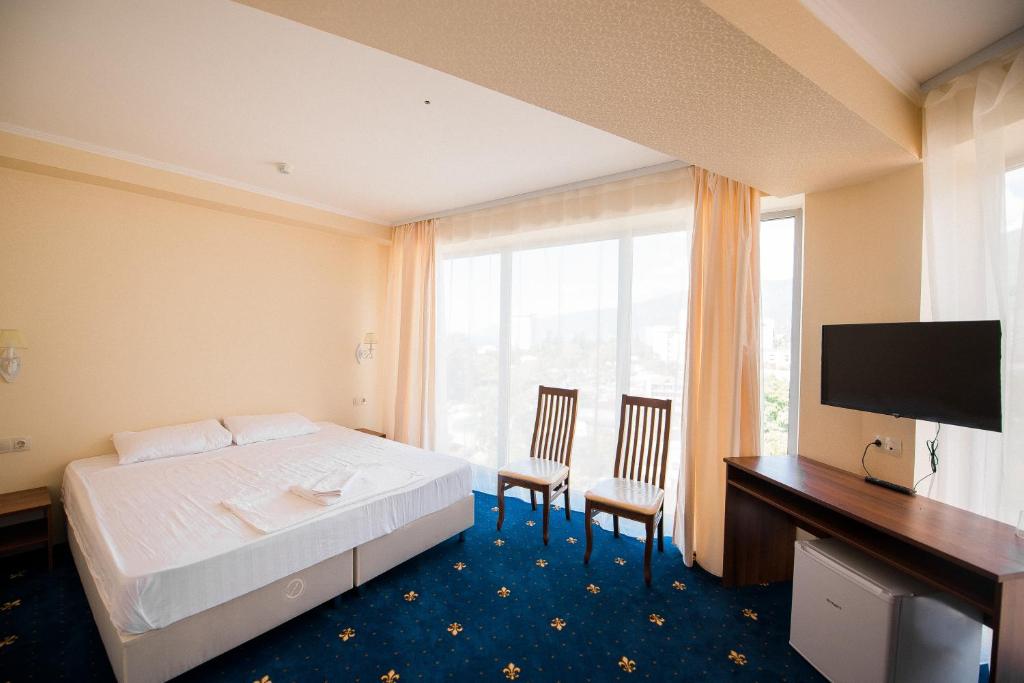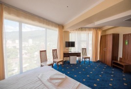 - 2-местный 1-комнатный Комфорт. Площадь: 20 кв.м. В номере: две односпальные кровати или одна двуспальная кровать, кондиционер, телевизор, холодильник, санузел с душем, фен, набор мини косметики. Номер без балкона с панорамным видом на горы или море/бассейн. Доп. место – еврораскладушка.