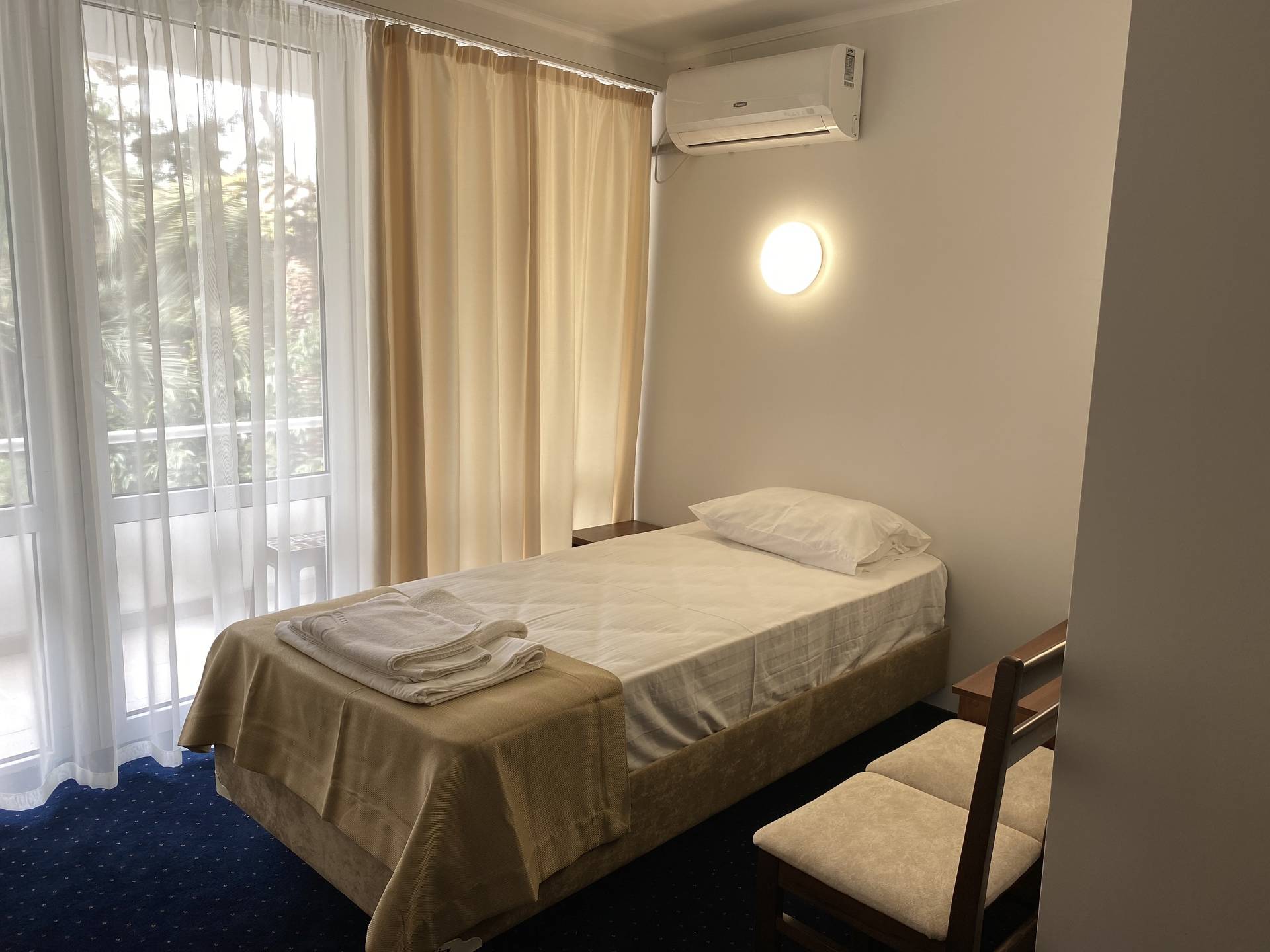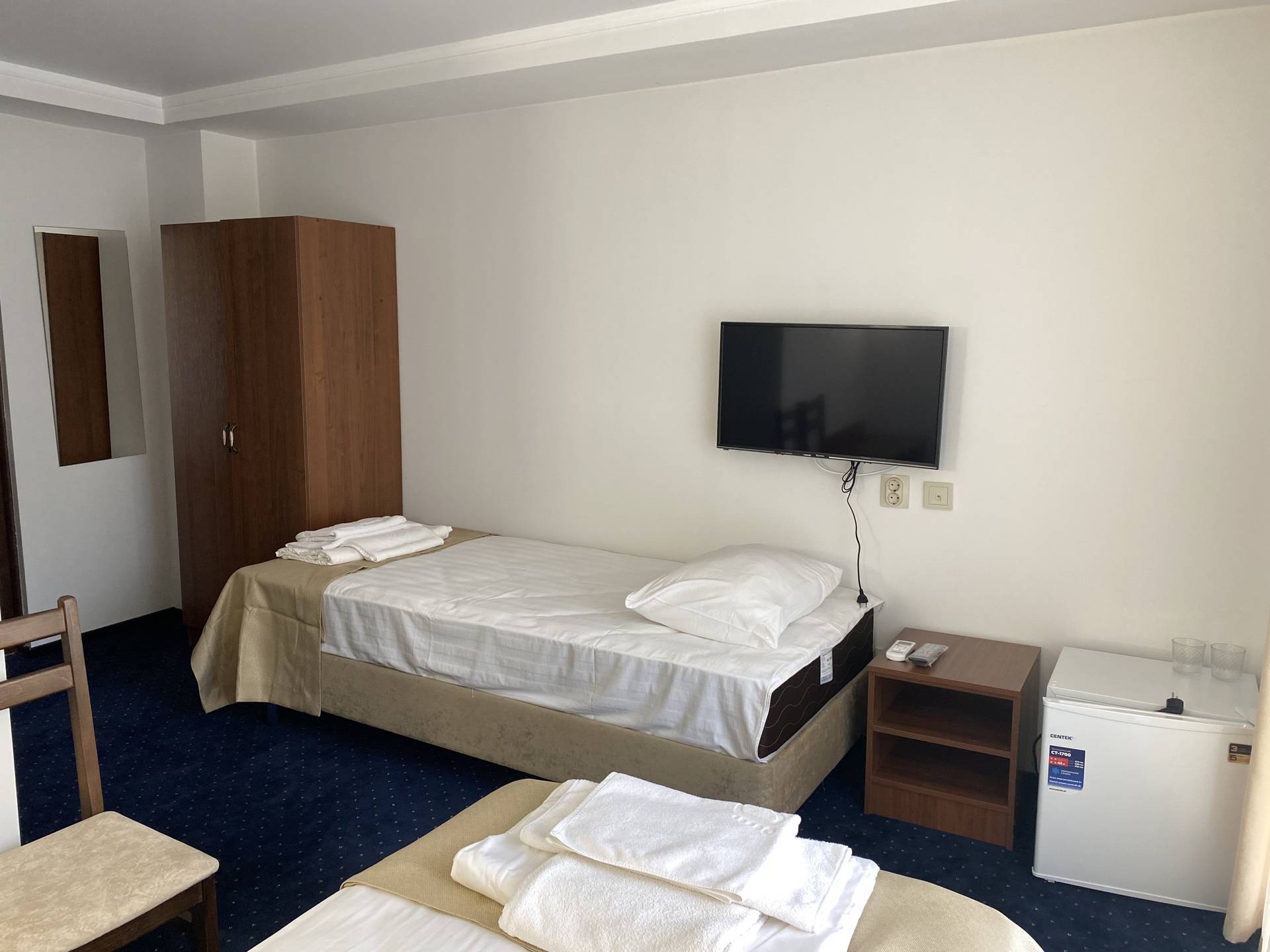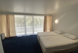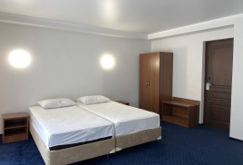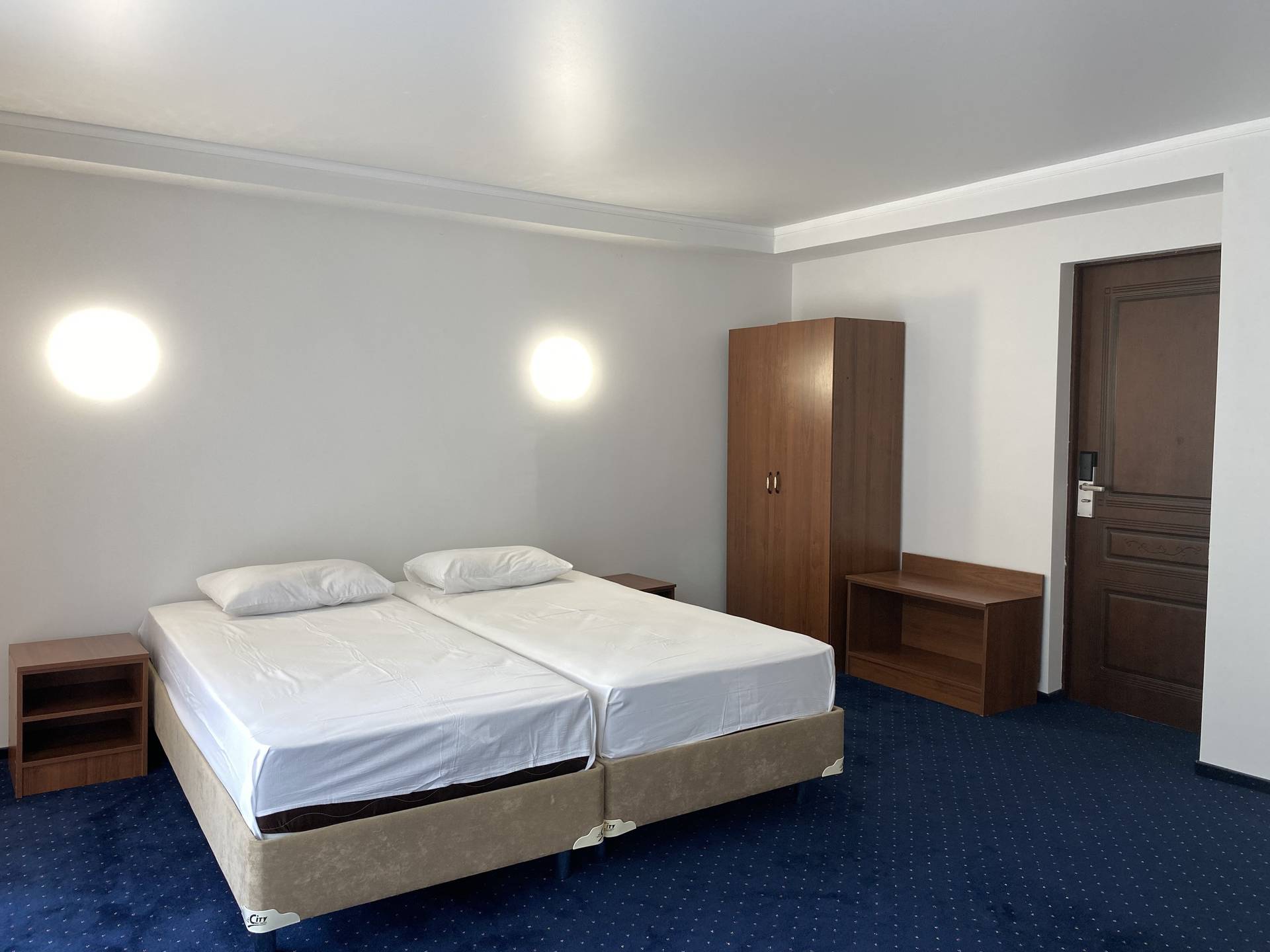 - 2-местный Стандарт. Площадь: 18-20 кв. м. В номере: две односпальные кровати или одна двуспальная кровать, телевизор, холодильник, кондиционер, санузел с душем, балкон. Дополнительное место - еврораскладушка.