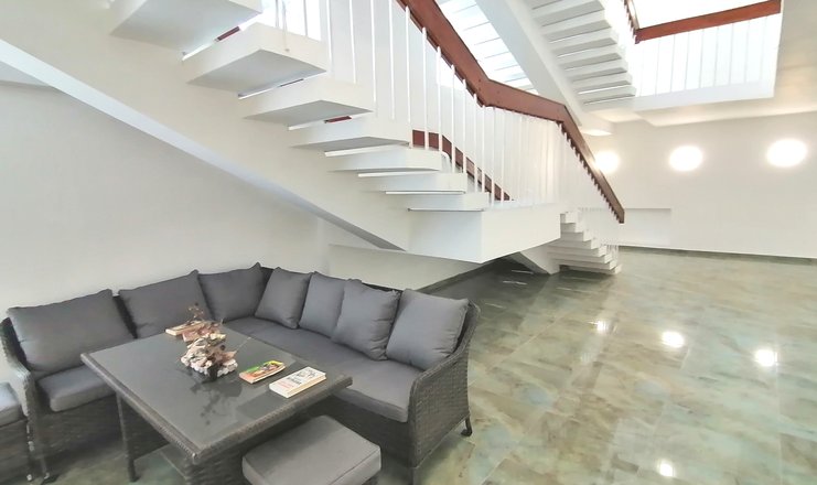- 2-местный 2-этажный 2-комнатный Стандарт. Площадь: 35 кв. м. В номере: на первом этаже расположена гостиная с мягкой мебелью, на втором этаже спальня с двуспальной кроватью, телевизор, холодильник, кондиционер, санузел с душем, небольшая веранда. Дополнительное место - диван.