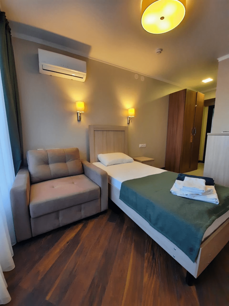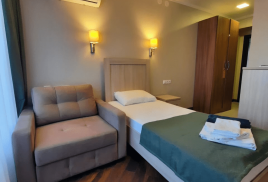 - 1-местный комфорт (макс. 1+1 чел., 18 кв. м, телевизор, кондиционер, ванна, фен, холодильник, балкон, 1,5-спальная кровать, чайник, туалет). Доп. место - кресло-кровать, может быть установлен без ограничения по возрасту.
