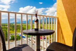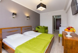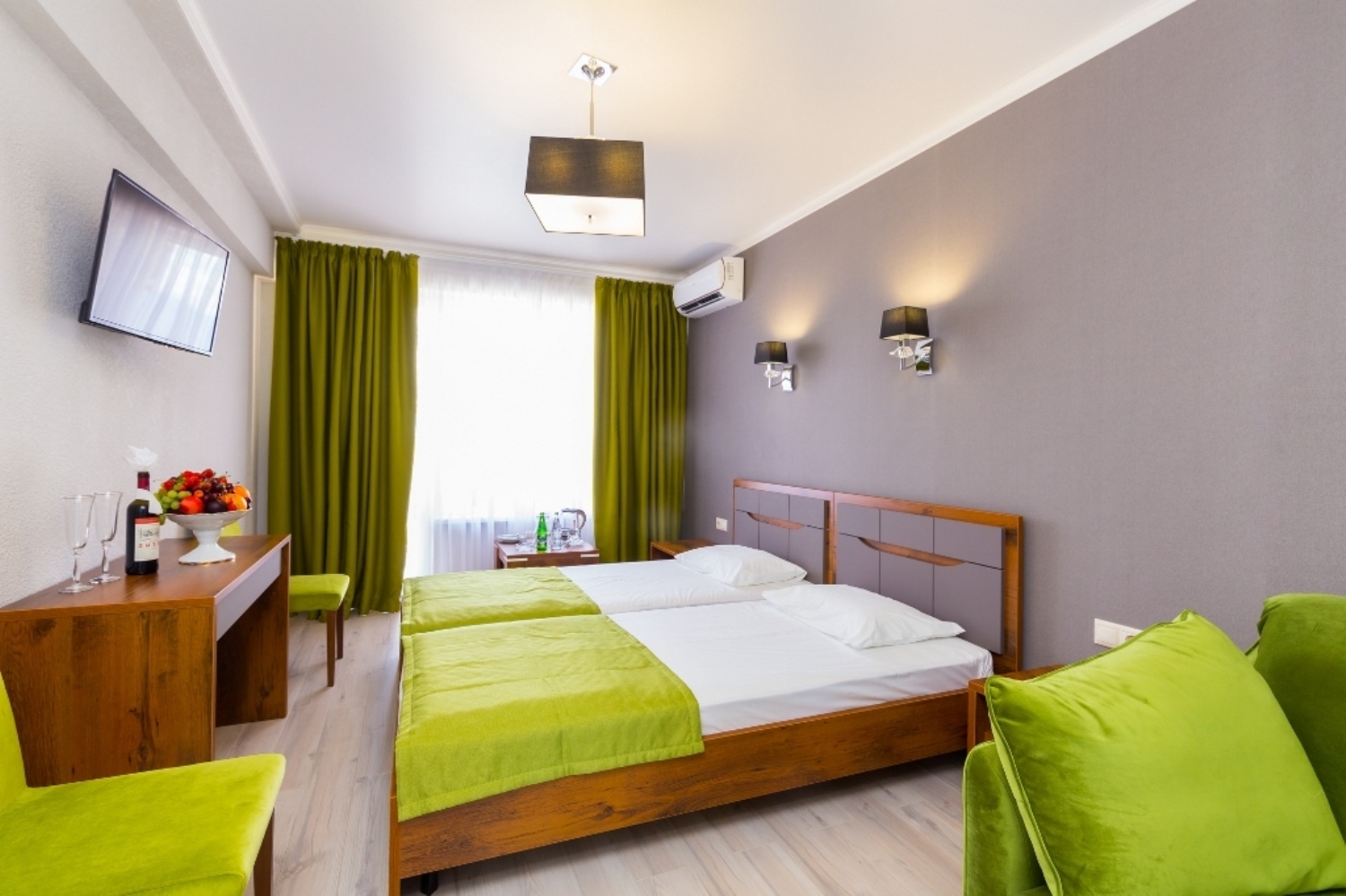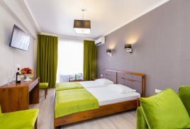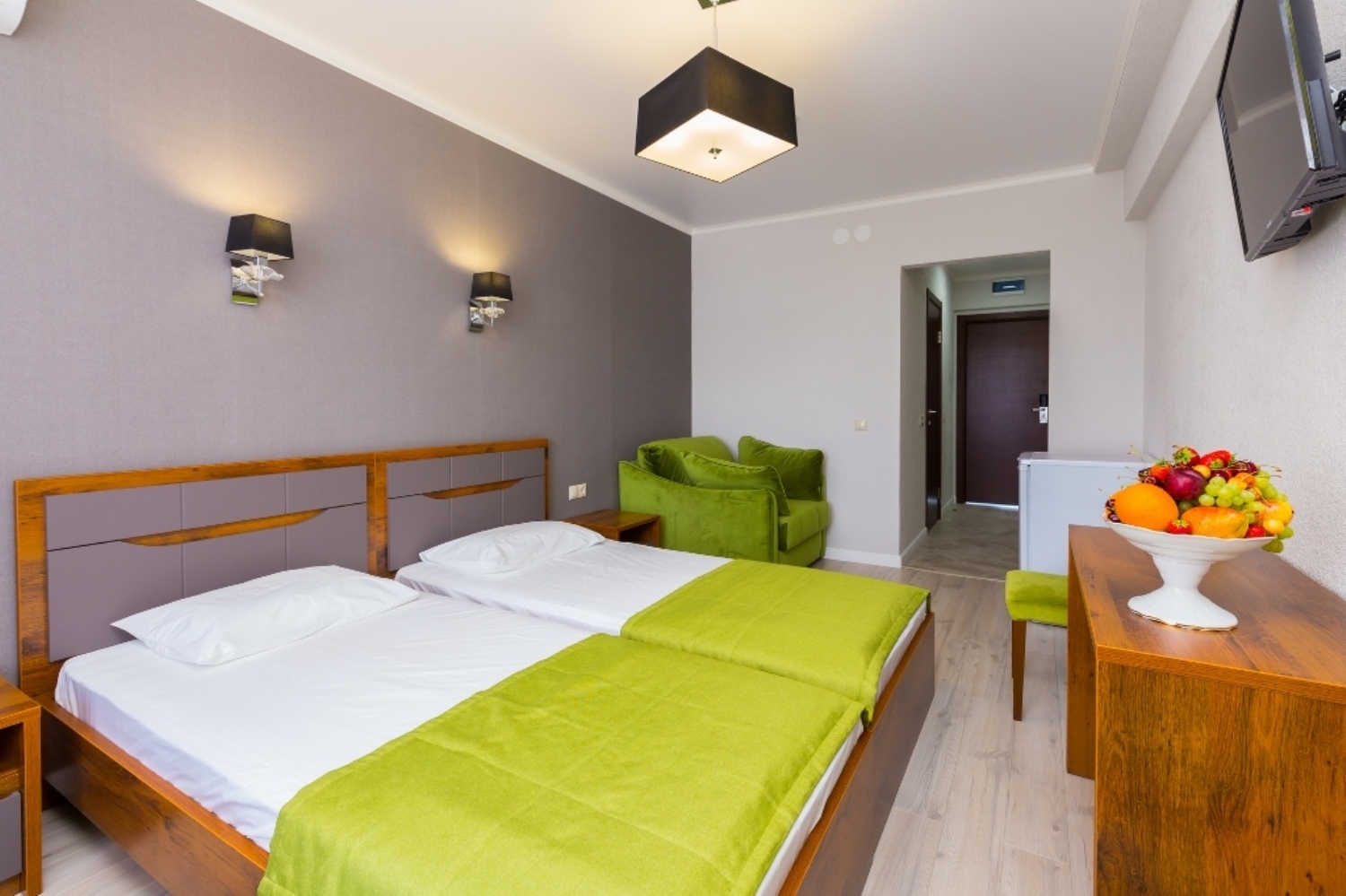 - 2-местный 1-комнатный номер (макс. 2+1 чел., 18-20 кв. м, телевизор, кондиционер, душ, фен, холодильник, балкон, 1,5-спальные/ 2-спальная кровать, чайник, туалет). Доп. место - кресло-кровать, может быть установлено без ограничения по возрасту.