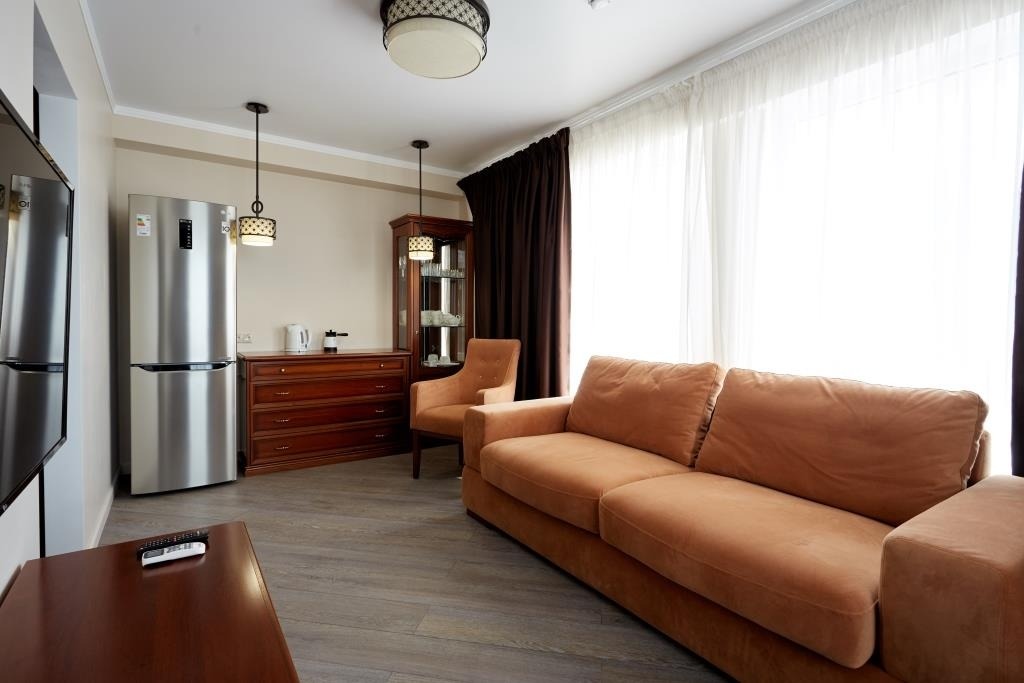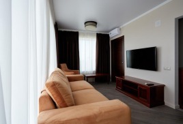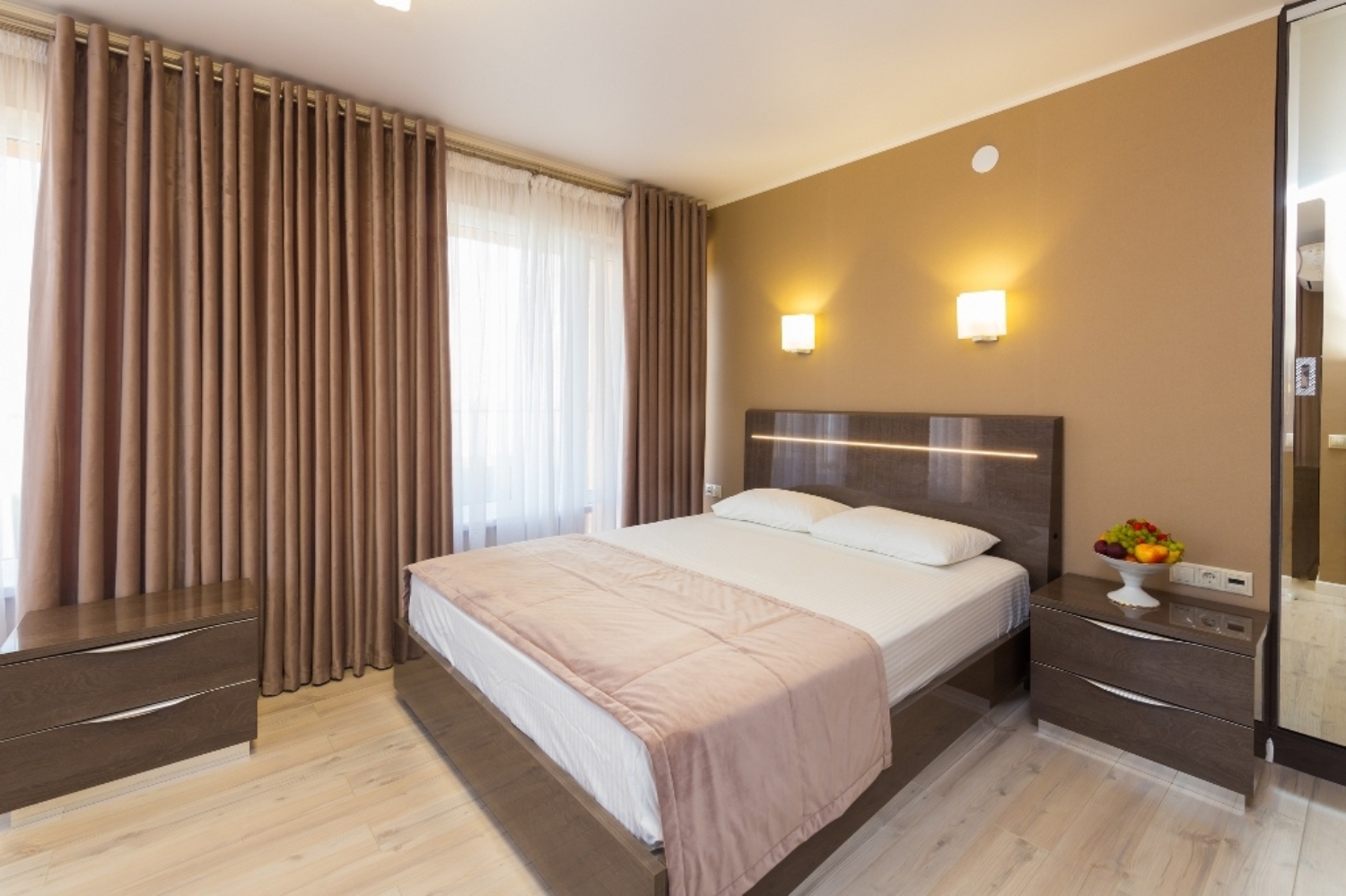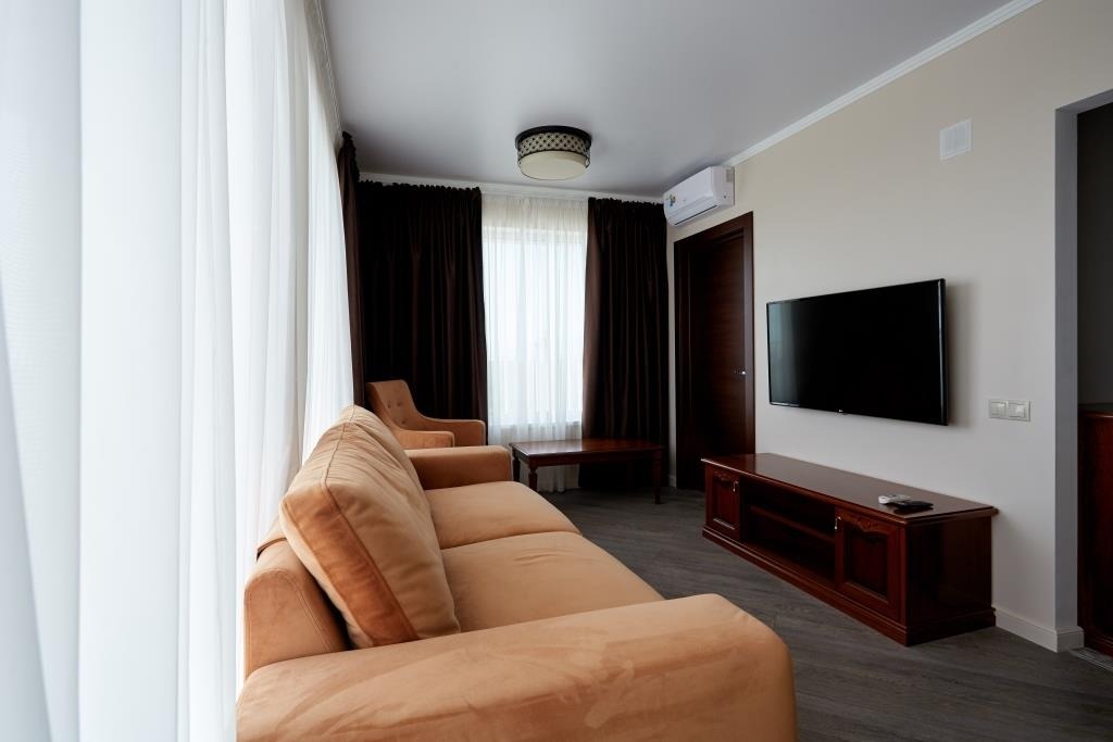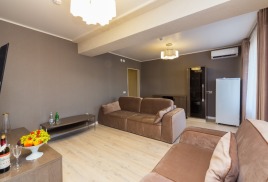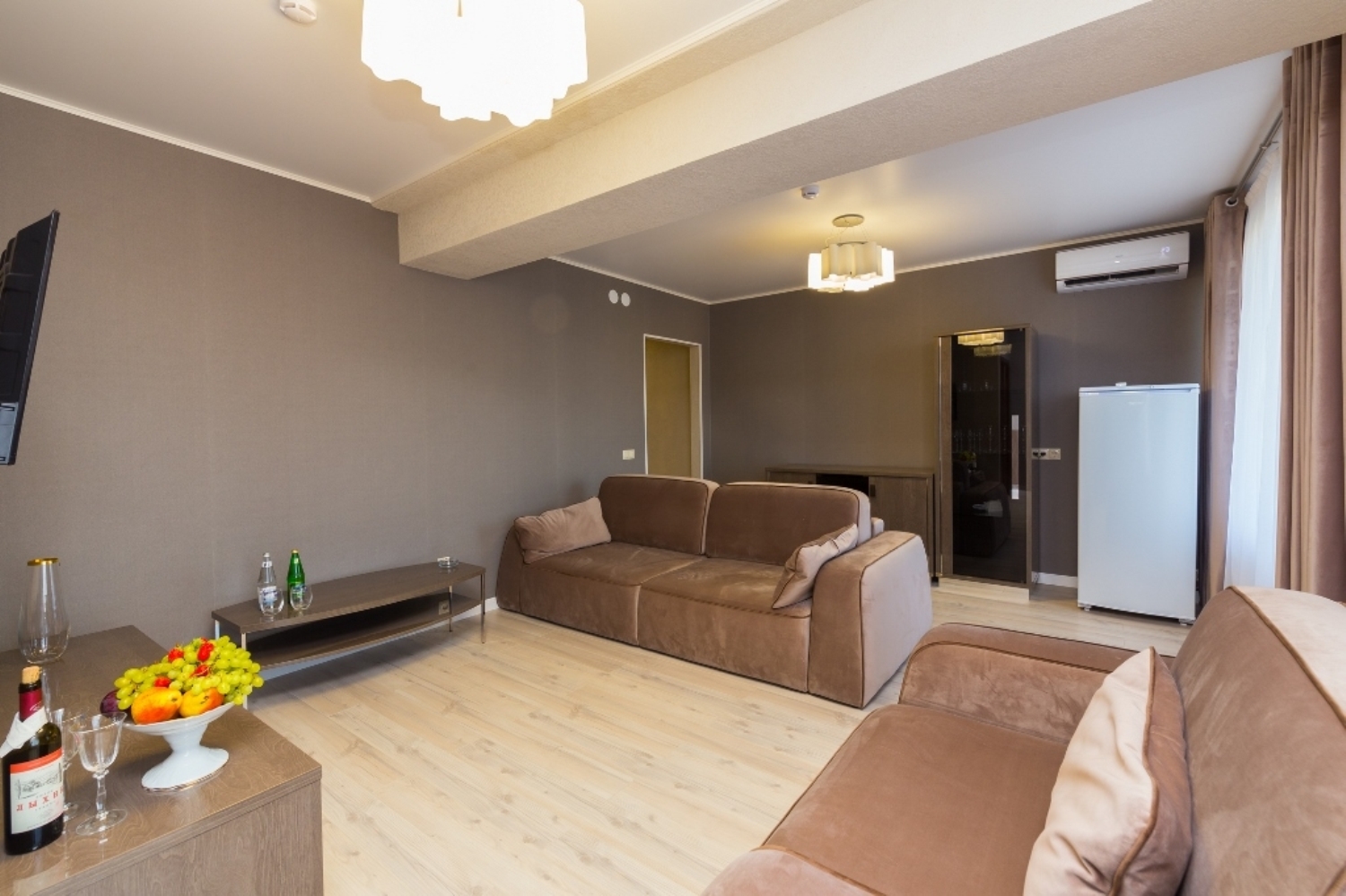 - 2-местный 2-комнатный полулюкс (макс. 2+3 чел., 30 кв. м, телевизор, кондиционер, ванна, фен, холодильник, балкон, мягкая мебель, 2-спальная кровать, чайник, туалет, номера располагаются с 1 по 2 этаж). Доп. место - диван и два кресла/кровати, может быть установлен без ограничения по возрасту.