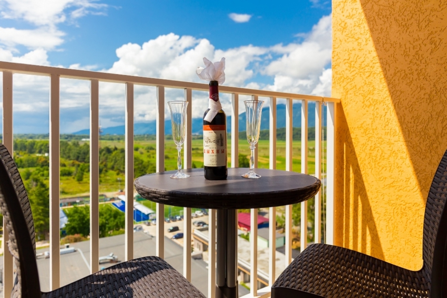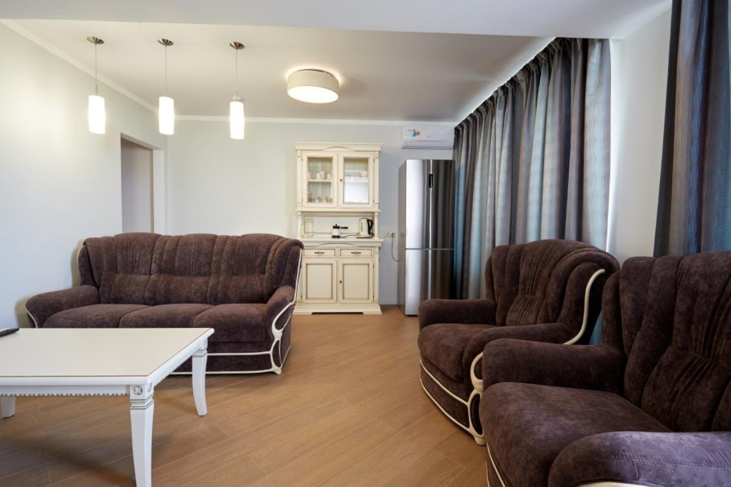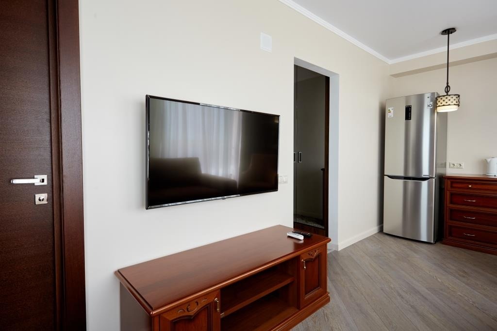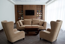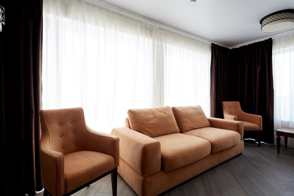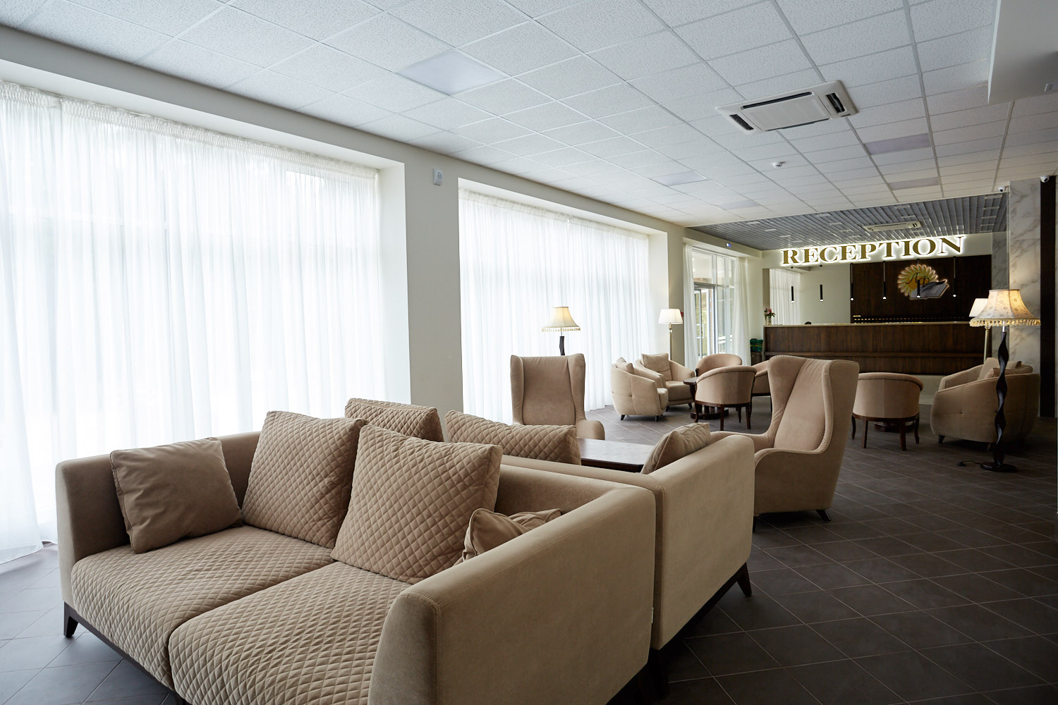 - 2-местный 2-комнатный полулюкс (макс. 2+3 чел., 30 кв. м, телевизор, кондиционер, ванна, фен, холодильник, балкон, мягкая мебель, 2-спальная кровать, чайник, туалет, номера располагаются с 1 по 2 этаж). Доп. место - диван и два кресла/кровати, может быть установлен без ограничения по возрасту.