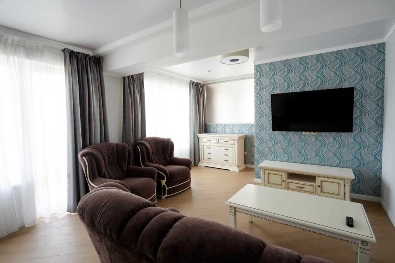 - 2-местный 2-комнатный люкс комфорт (макс. 2+2 чел., телевизор, кондиционер, ванна, фен, холодильник, балкон, мягкая мебель, 2-спальная кровать, чайник, набор посуды, гостиная, туалет, после ремонта. ). Доп. место - кресло-кровать, может быть установлен без ограничения по возрасту.