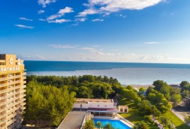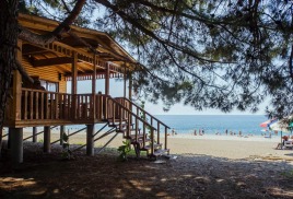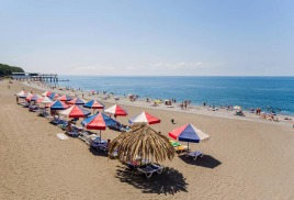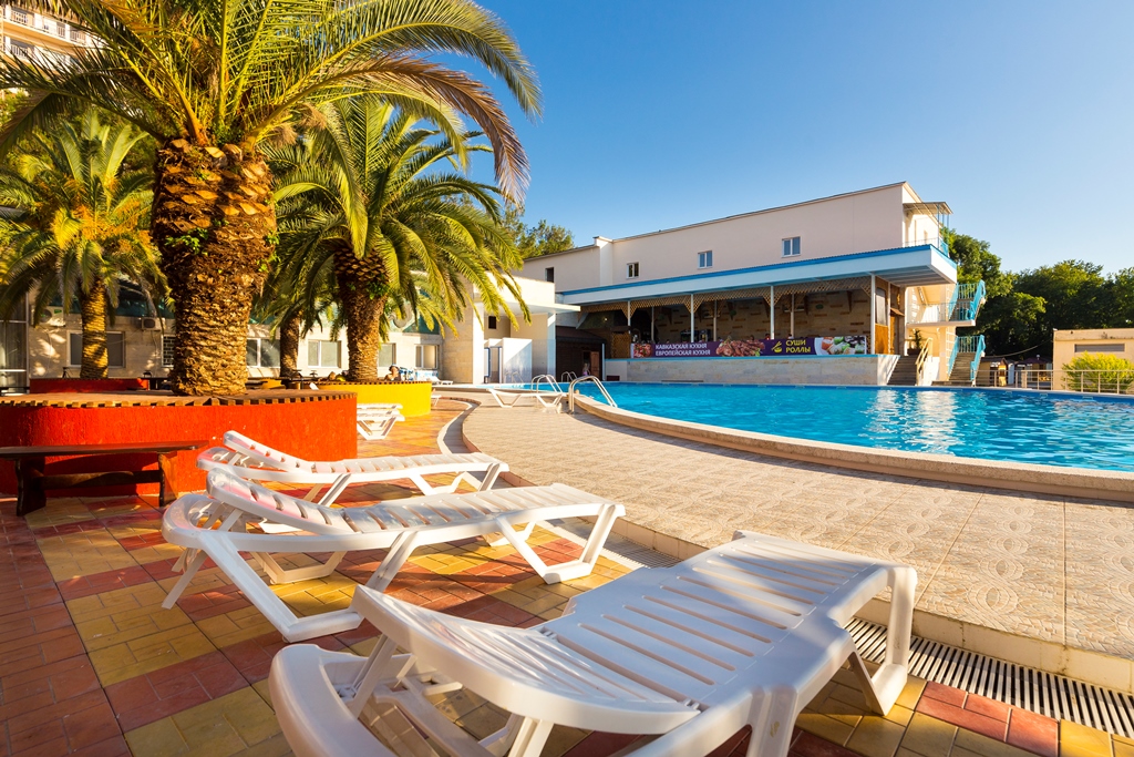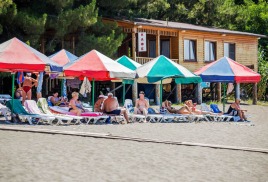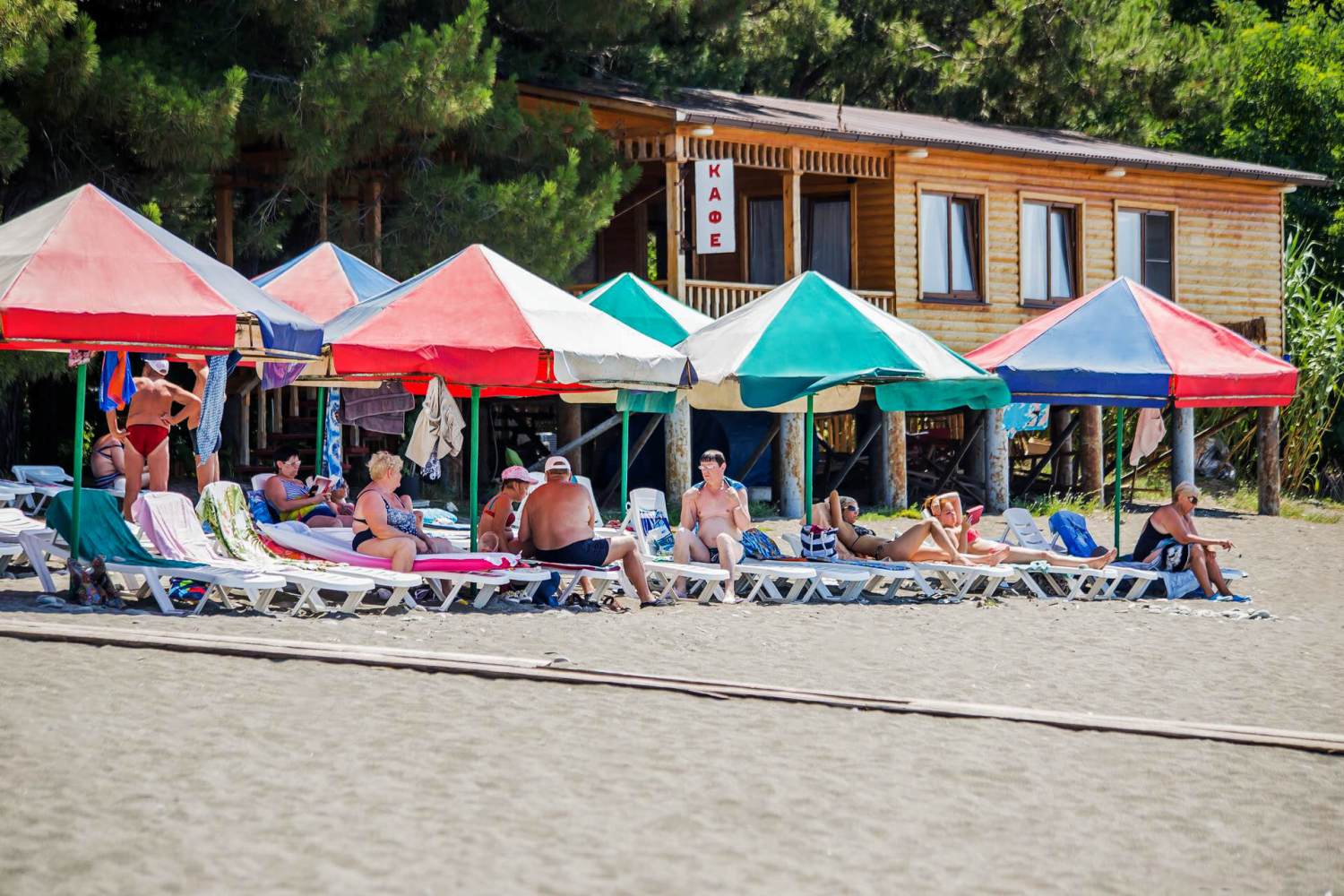 Пляж: собственный песчано-галечный, в 75 м от пансионата. Оборудован лежаками, зонтиками, кабинками для переодевания и душем.