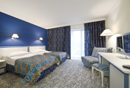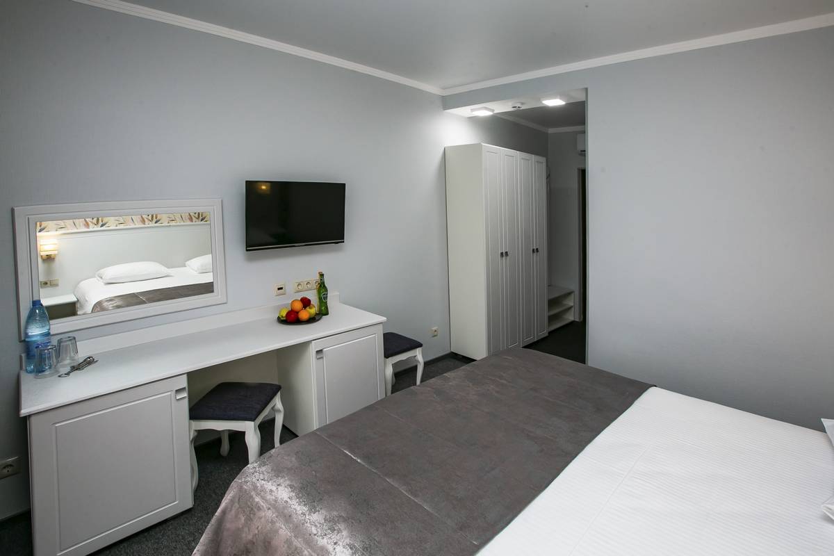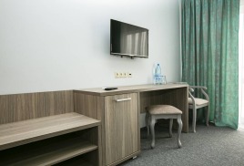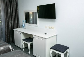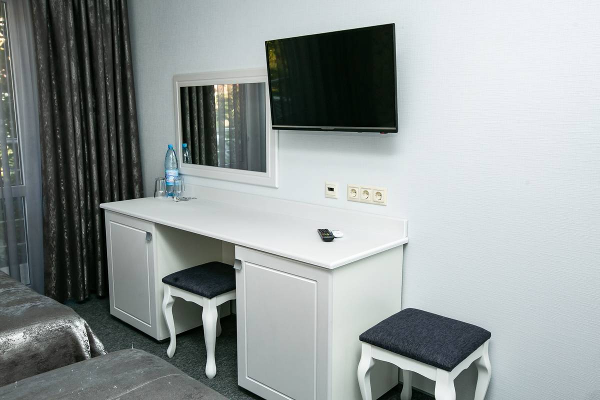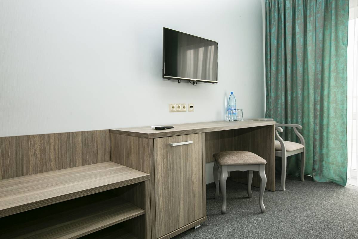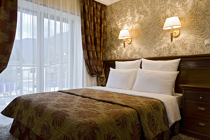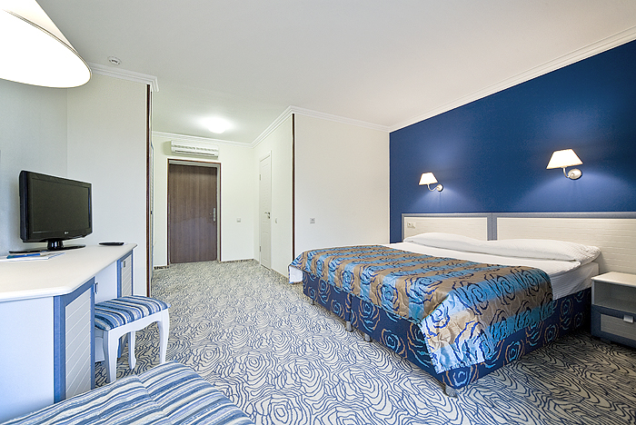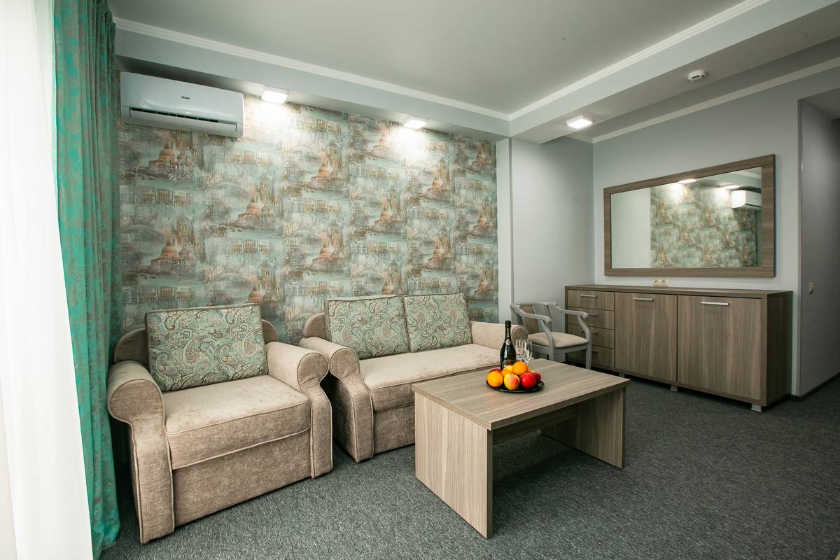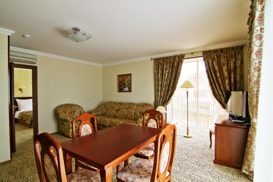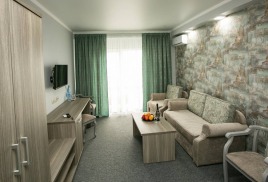 - 2-местный 2-комнатный Люкс. Площадь: 40 кв.м. В номере: спальня с двуспальной кроватью, гостиная с мягкой мебелью, телевизор, холодильник, сплит-система, чайник с набором посуду, санузел с душем, фен, халат и тапочки. Балкон с видом на море.