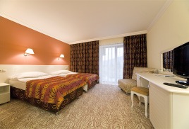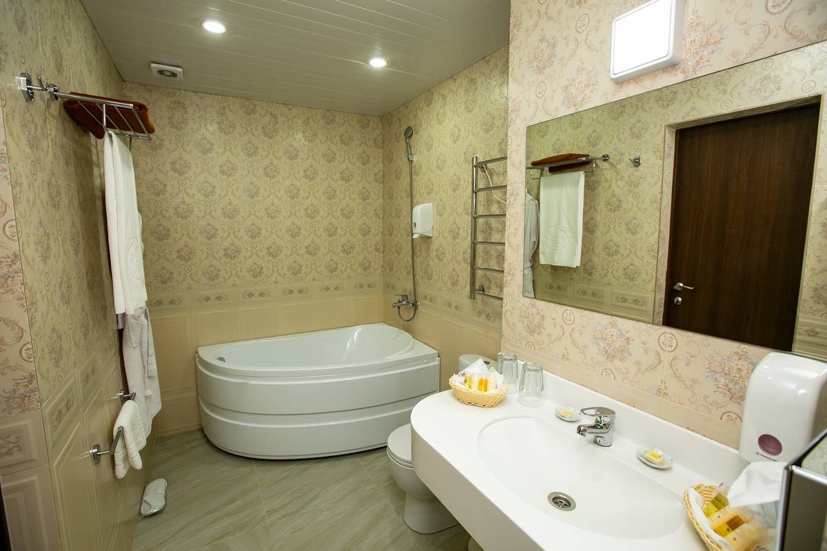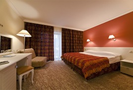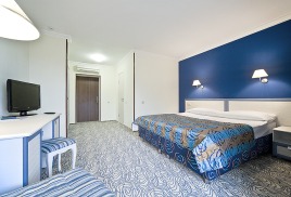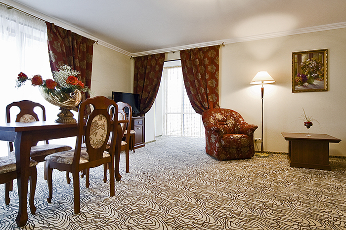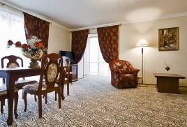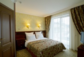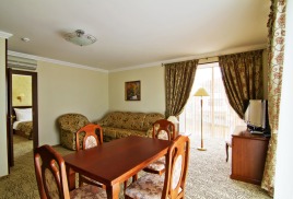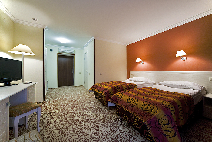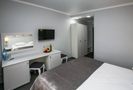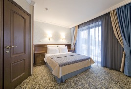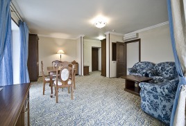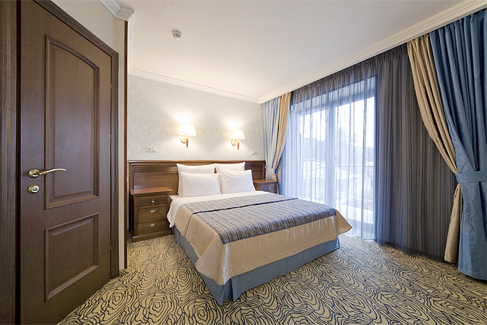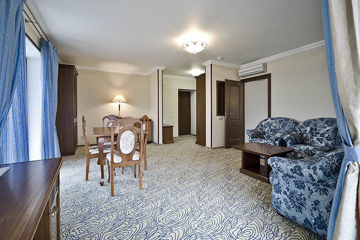 - 2-местный 2-комнатный Люкс. Площадь: 43 кв.м. В номере: спальня с двуспальной кроватью, гостиная с мягкой мебелью, телевизор, холодильник, сплит-система, чайник с набором посуду, санузел с душем, фен, халат и тапочки, балкон.