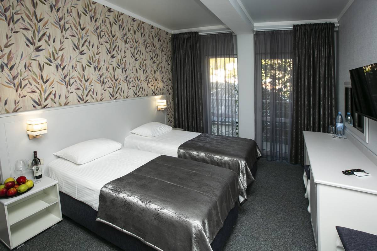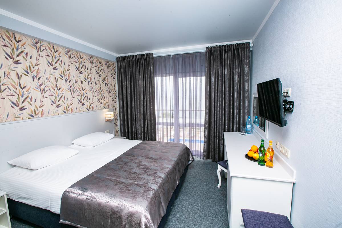 - 2-местный 1-комнатный Стандарт с видом на море. Площадь: 19 кв.м. В номере: две односпальные кровати или одна двуспальная кровать, телевизор, холодильник, сплит-система, санузел с душем, фен. Балкон с видом на море. Доп. место - еврораскладушка.