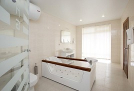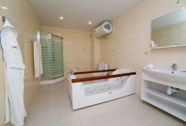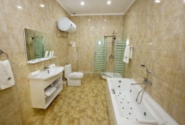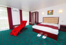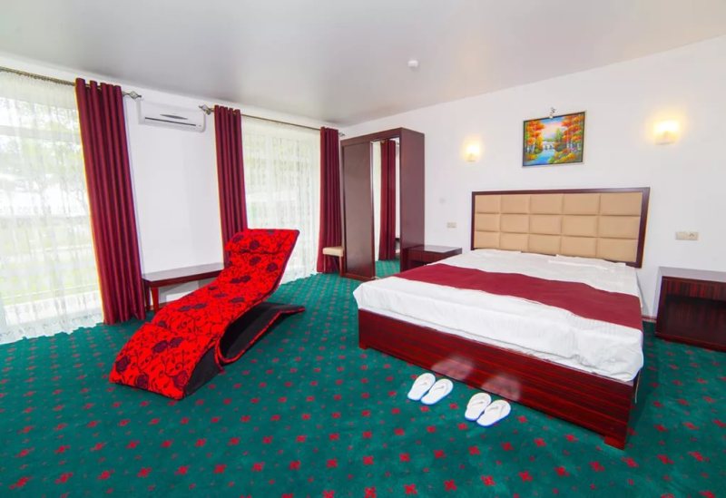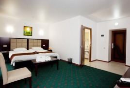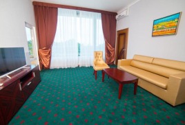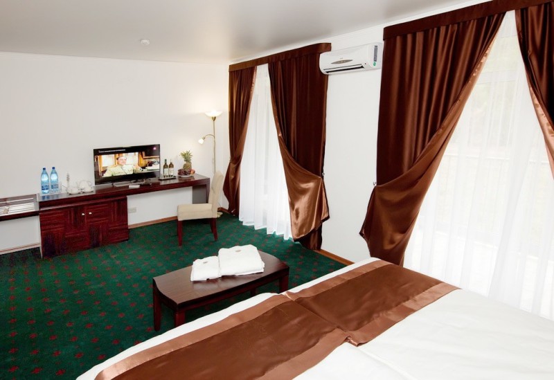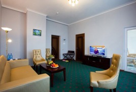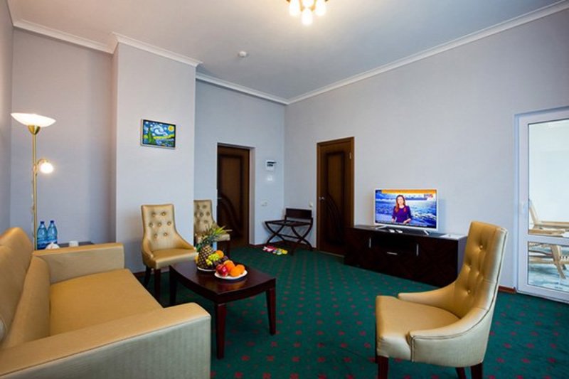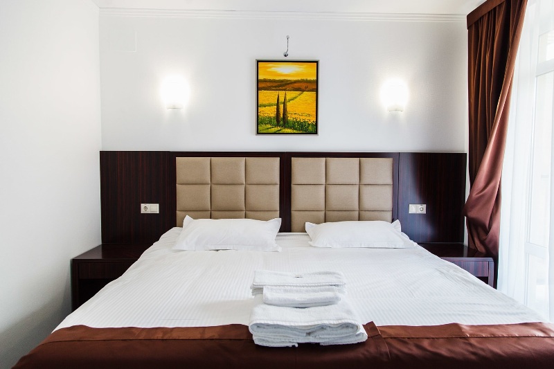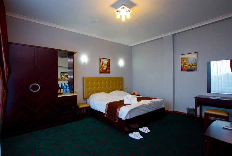 2-х местные 1-но комнатные номера «Люкс»: площадь номера 45м2 (плюс балкон 12 м2), с/у с джакузи, душевой кабиной и феном, кондиционер, телевизор 40«, мини-бар, сейф, кровать «кинг-сайз» 2.2×1.8м с ортопедическим матрасом, халат, велюровые тапочки, free Wi-Fi;