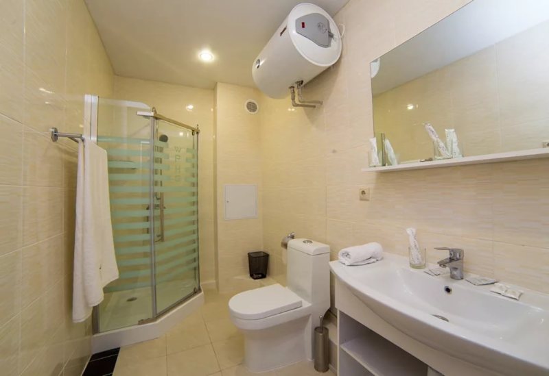 2-х местные 1-но комнатные номера «Комфорт»: площадь номера 30м2 (плюс балкон 8 м2), с/у с душевой кабиной и феном, кондиционер, телевизор 40«, мини-бар, сейф, две кровати «бокс-спринг» 2×1м либо «кинг-сайз» 2.2×1.8м с ортопедическим матрасом, free Wi-Fi;