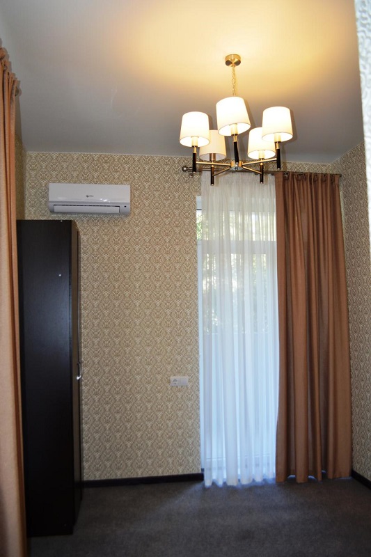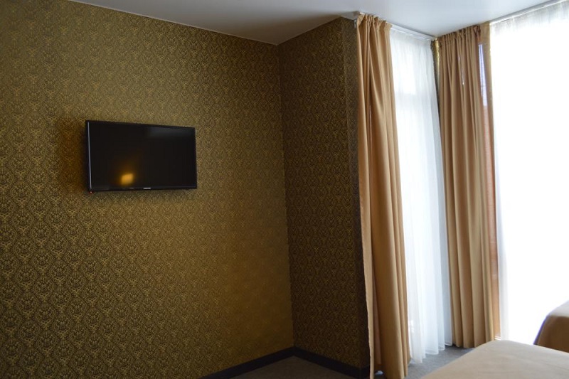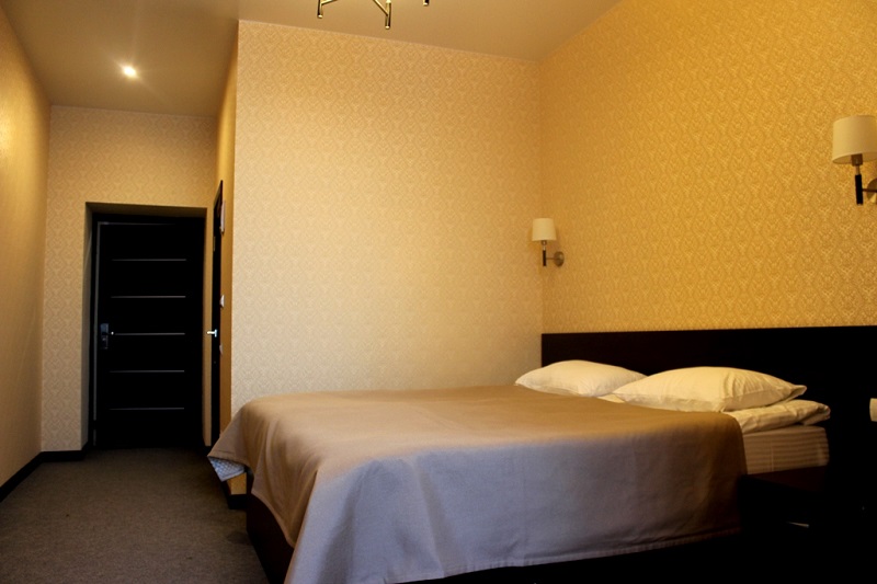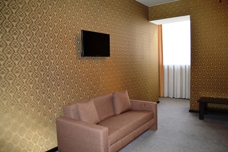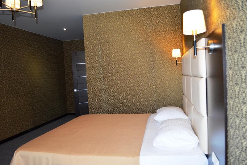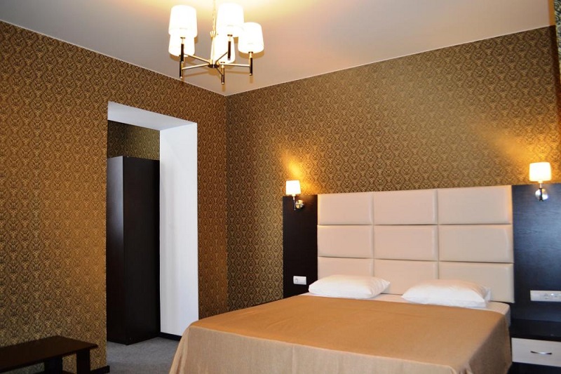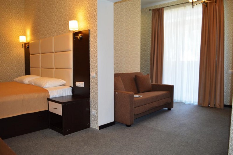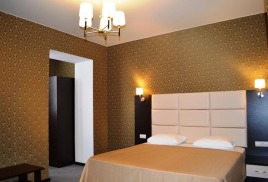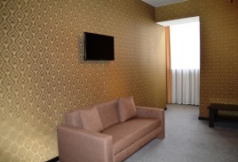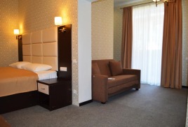 - 2-местный 2-комнатный Люкс. Площадь: 22-26 кв.м. В номере: одна двуспальная кровать, диван, кондиционер, телевизор, холодильник, чайник с набором посуды, санузел с душем, фен, халат и тапочки, сейф. Балкон не во всех номерах.