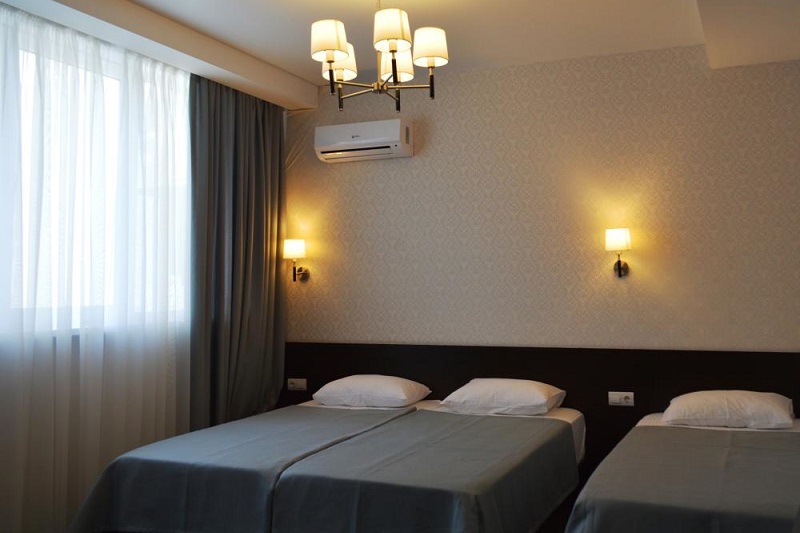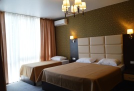 - 3-местный 1-комнатный Стандарт. Площадь: 19-23 кв.м. В номере: три односпальные кровати или одна двуспальная кровать и одна односпальная кровать, кондиционер, телевизор, холодильник, чайник с набором посуды, санузел с душем, фен, халат и тапочки, сейф. Балкон не во все номерах. Доп. место - не предусмотрено.