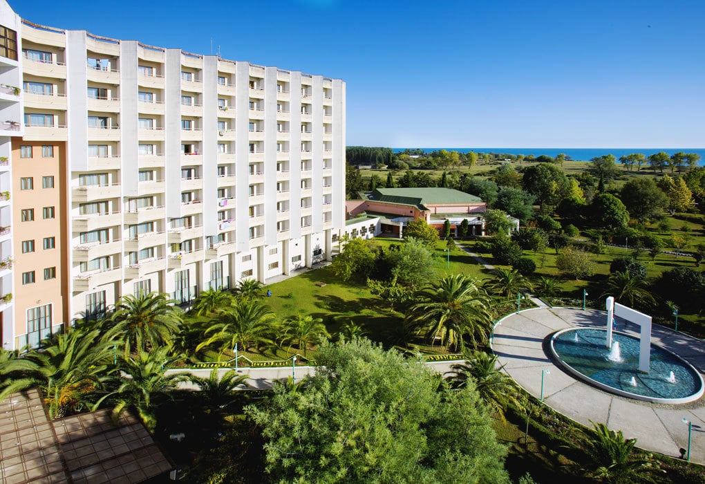 Пансионат «Самшитовая роща» - один из самых комфортабельных пансионатов на побережье Абхазии, построенный в 1990 году турецкой компанией «Корай – Байтур». Пансионат представляет собой современный десятиэтажный гостиничный комплекс со стильным европейским интерьером и элегантным дизайном. Пансионат «Самшитовая роща» расположен у моря, среди вечнозеленой самшитовой рощи и субтропического парка. Расстояние до центра Пицунды - 7 км, расстояние до границы с Россией - около 40 км.