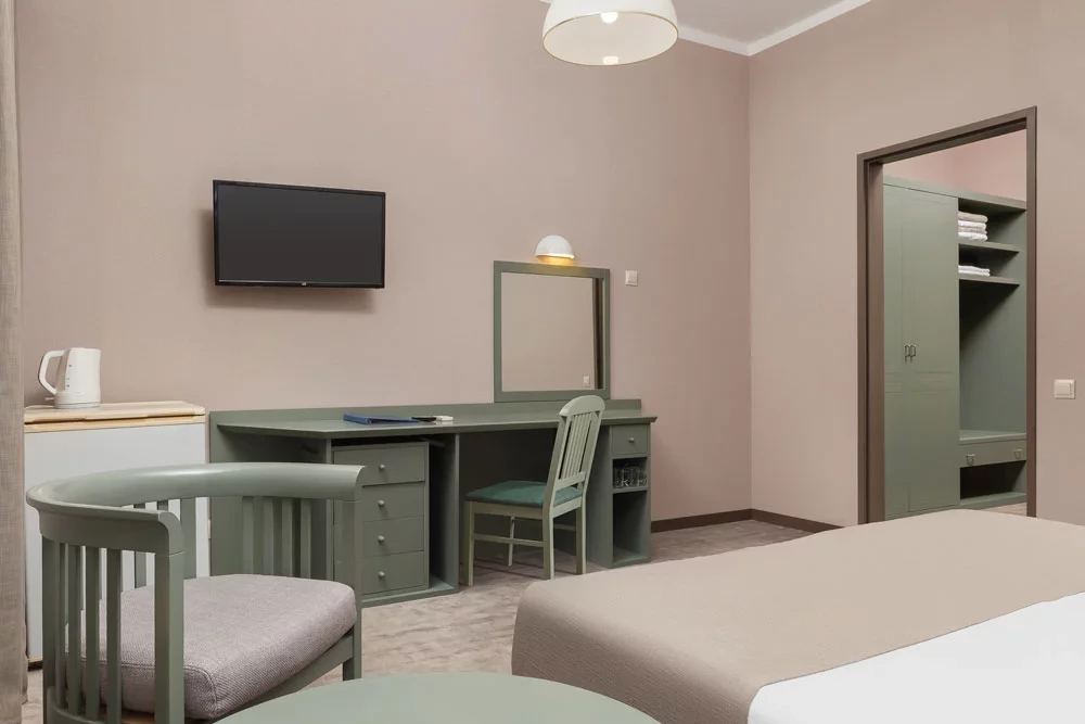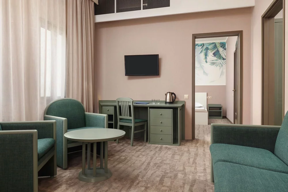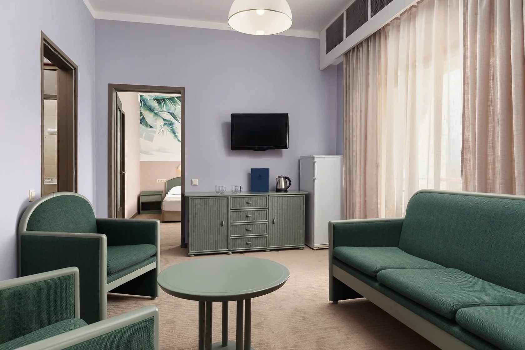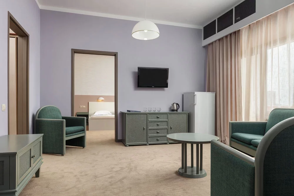 - 2-местный 2-комнатный полулюкс. (50 кв.м). Спальня и гостиная. В номере ковровое покрытие, просторный балкон (оснащенный столиком и креслами). Двуспальная кровать, шкаф для одежды, набор мягкой мебели, дополнительное место: евро раскладушка (до 3 мест), сплит-система, холодильник, телевизор с кабельным телевидением, сушилка для белья, электрический чайник, чайная пара, фен, сейф, душ, туалет, халаты, тапочки. Панорамный вид на горы.