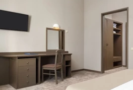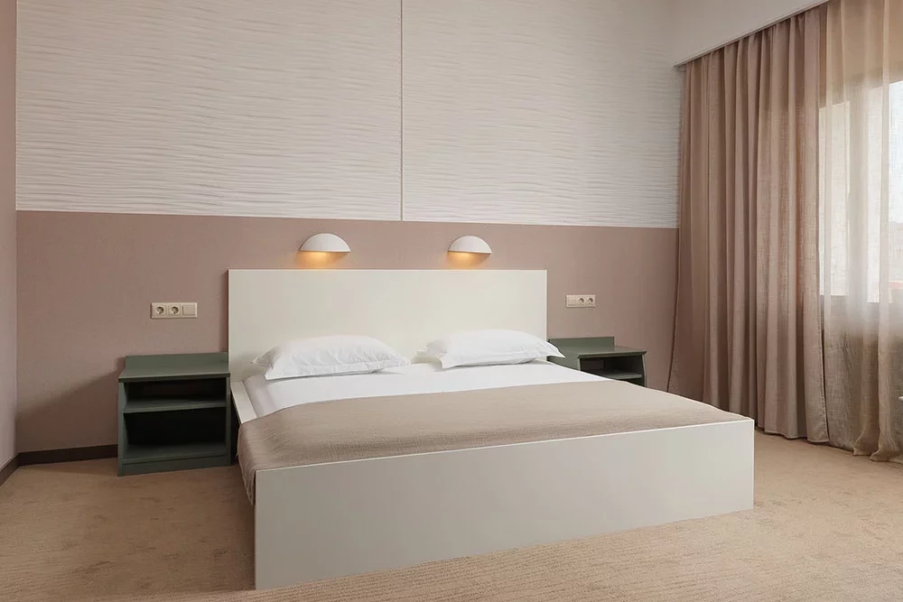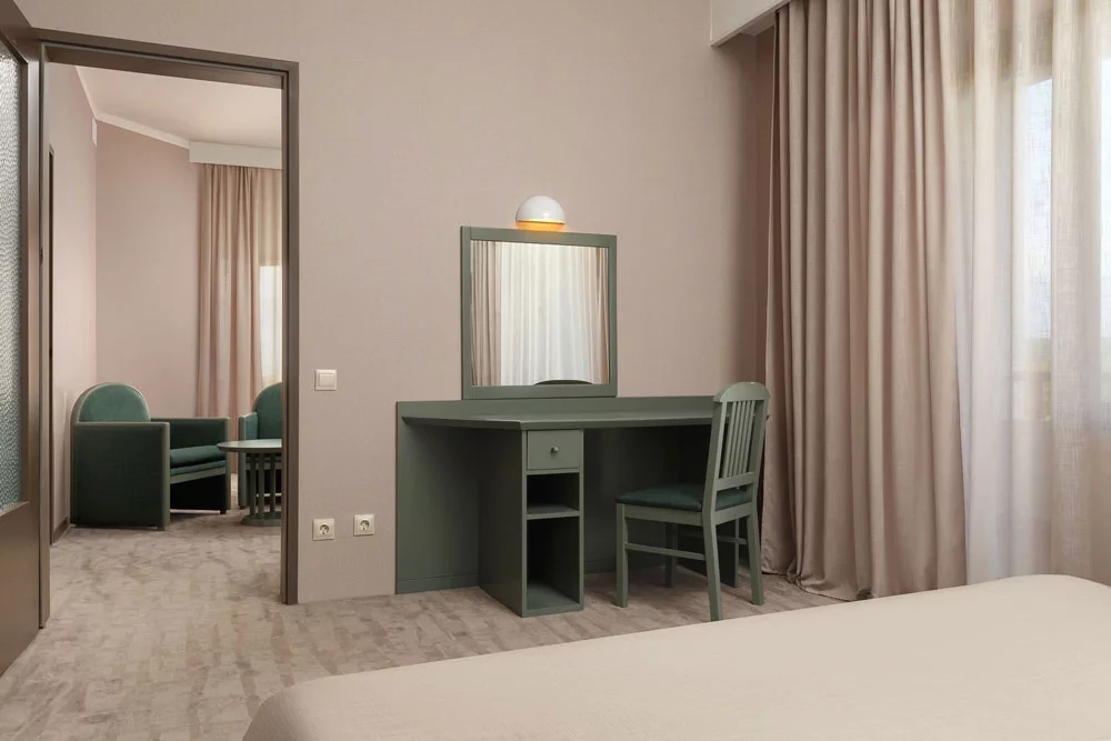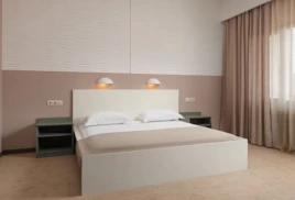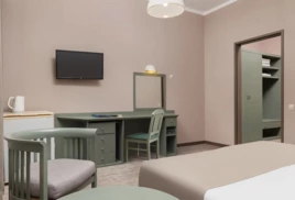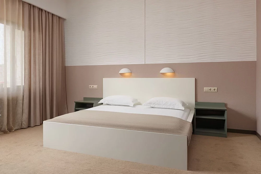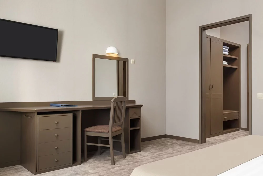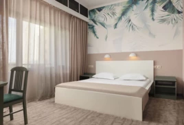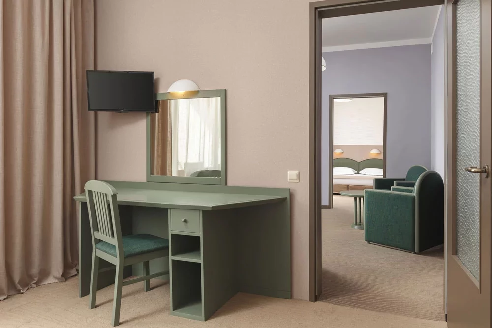 - 2-местный 2-комнатный полулюкс. (50 кв.м). Спальня и гостиная. В номере ковровое покрытие, просторный балкон (оснащенный столиком и креслами). Двуспальная кровать, шкаф для одежды, набор мягкой мебели, дополнительное место: евро раскладушка (до 3 мест), сплит-система, холодильник, телевизор с кабельным телевидением, сушилка для белья, электрический чайник, чайная пара, фен, сейф, душ, туалет, халаты, тапочки. Панорамный вид на горы.