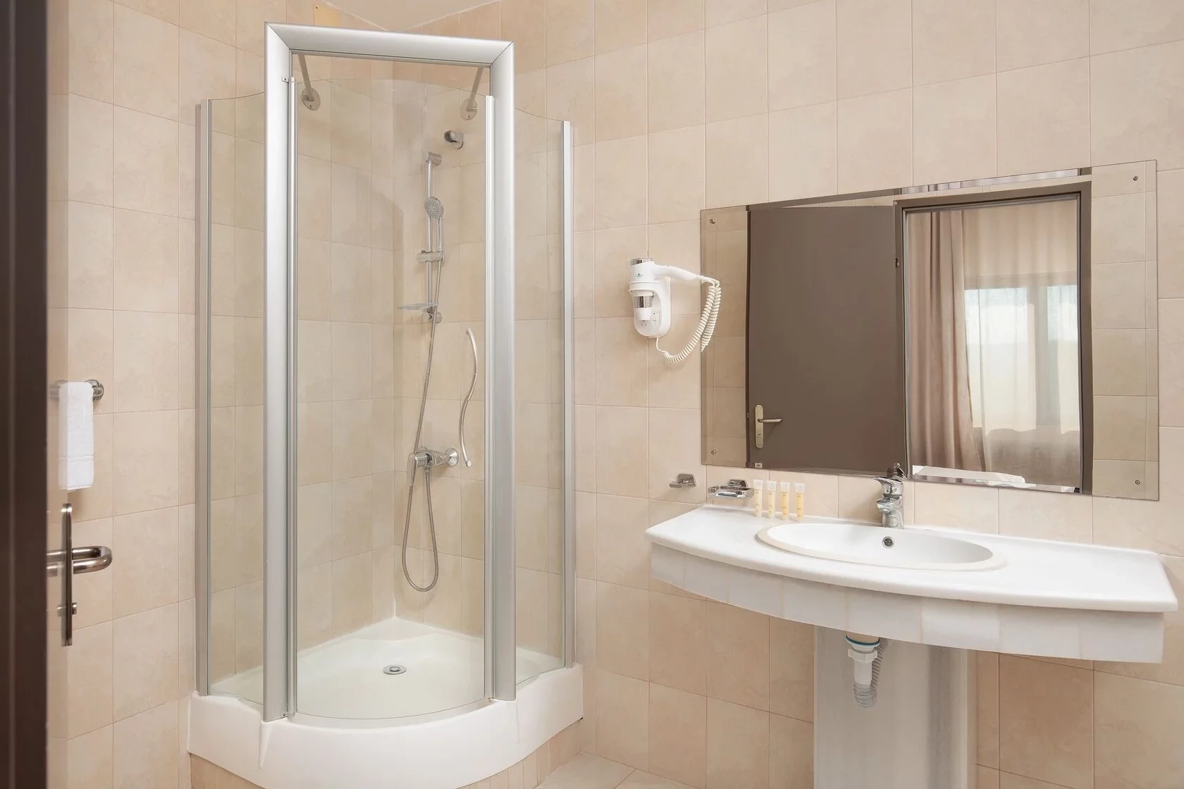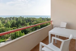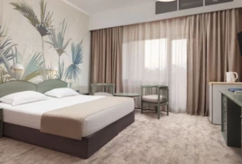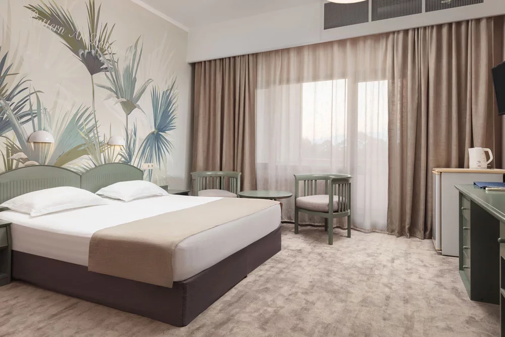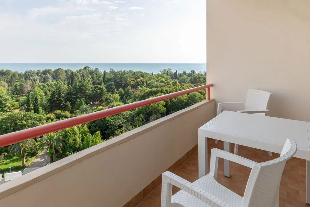 - 2-местный комфорт (25 кв.м) - В номере ковровое покрытие, балкон (оснащенный столиком и креслами). Две односпальные кровати, шкаф для одежды, сплит-система, холодильник, электрический чайник, чайная пара, телевизор с кабельным телевидением, сейф, фен, душ, туалет. Панорамный вид на море или горы. В номере категории Комфорт – максимальное размещение 3 чел. (Доп. место - евро раскладушка).