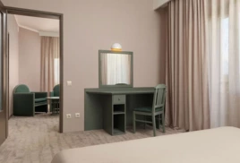 - 2-местный 3-комнатный люкс (75 кв.м). Гостиная, две спальни (двуспальная кровать и односпальная кровать (тарифицируется как доп. место), просторная прихожая, два балкона (оснащенный столиком и креслами). Два санузла с ванной и биде. Ковровое покрытие, шкаф для одежды, журнальный столик, набор мягкой мебели, дополнительные места: односпальная кровать (1) и евро раскладушка (до 2 мест), сплит-система, холодильник, телевизор с кабельным телевидением, электрический чайник, набор посуды, фен, сейф, сушилка для белья, халаты, тапочки. Панорамный вид на море или горы.