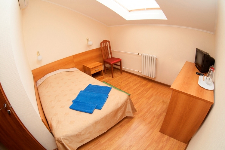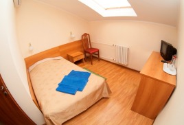 - 1-комнатный 1-местный номер (стандарт) - без доп. мест, 4 этаж, мансардное окно (в крыше), без балкона.В номере: одна одноместная кровать, прикроватная тумбочка, шкаф/платяной шкаф, стул, стол/туалетный стол, сплит-система, потолочное освещение, прикроватный светильник, телевизор, мини-холодильник.В ванной комнате: ванная/душевая кабина, санузел, зеркало, туалетные принадлежности.