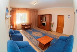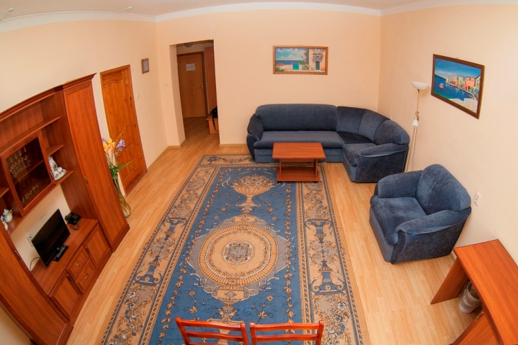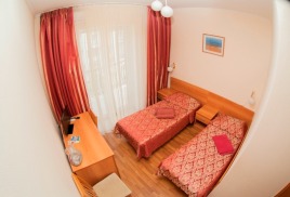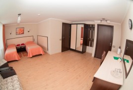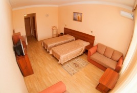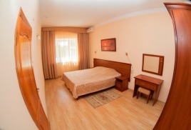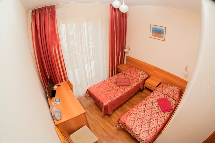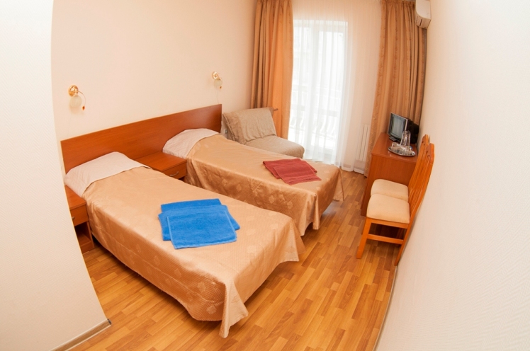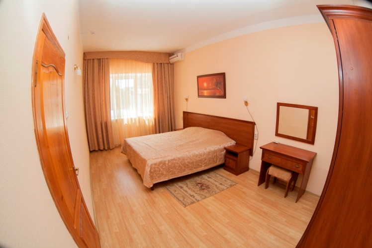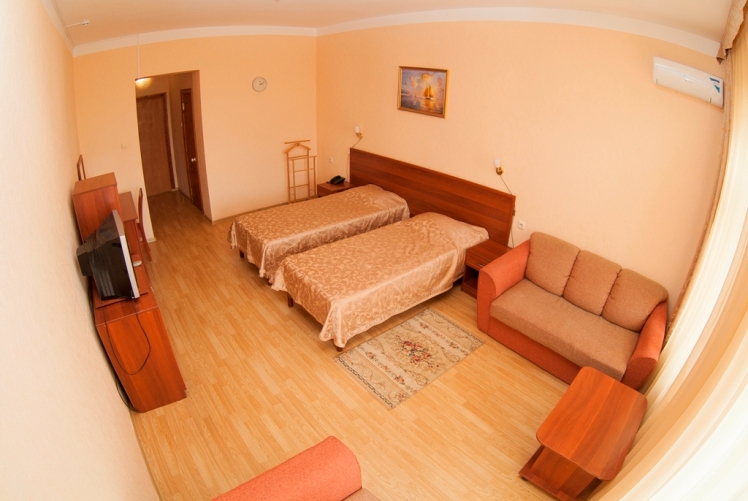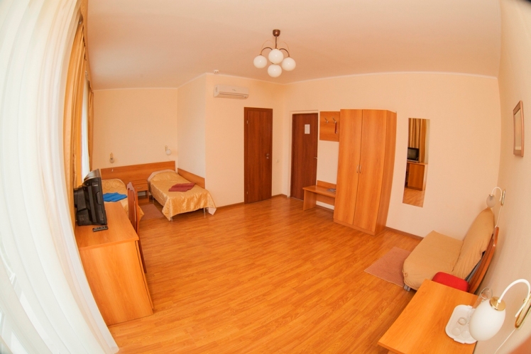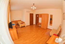 - 1-комнатный 2-местный номер (стандарт)- 1 доп. место.В номере: две одноместные кровати, две прикроватные тумбочки, шкаф/платяной шкаф, секретер, диван (раскладной), кресло, журнальный столик, стол, стулья, половое покрытие- ламинат, сплит- система, потолочное освещение, два прикроватных светильника, телевизор, мини-холодильник, телефон, настенные часы, чайный сервиз, электрический чайник.В ванной комнате: ванная, санузел, зеркало, туалетные принадлежности.