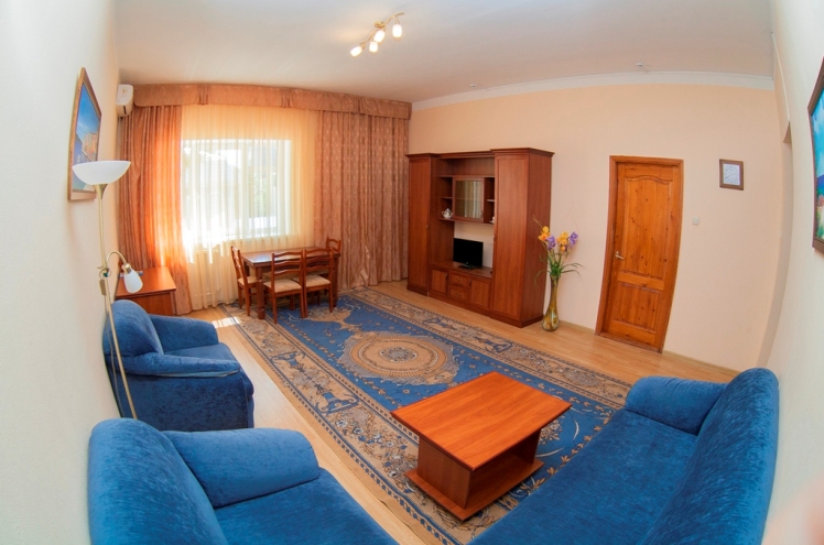 - 2-комнатный 2-местный номер (стандарт)- 1 доп. место.В номере: две одноместные кровати, две прикроватные тумбочки, шкаф, платяной шкаф, туалетный столик с пуфиком, диван (раскладной), кресло, столы, стулья, мебельный гарнитур, сплит- система, потолочное освещение, два прикроватных светильника, половое покрытие- ламинат, два прикроватных коврика, ковер в гостиной, телевизор, мини-холодильник, телефон, торшер, чайный сервиз, электрический чайник.В ванной комнате: ванная, санузел, зеркало, туалетные принадлежности.