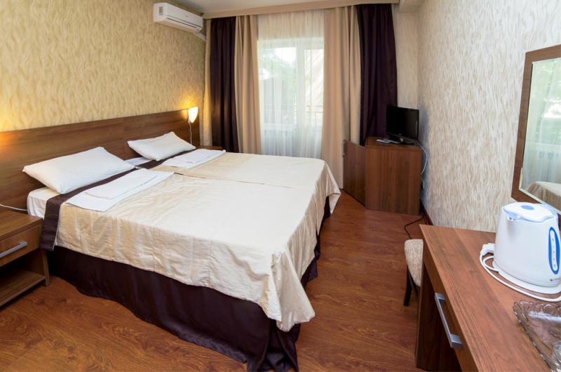 В номере: душ, туалет, ТВ, мини-бар, кондиционер, набор посуды, две раздельные кровати, балкон.