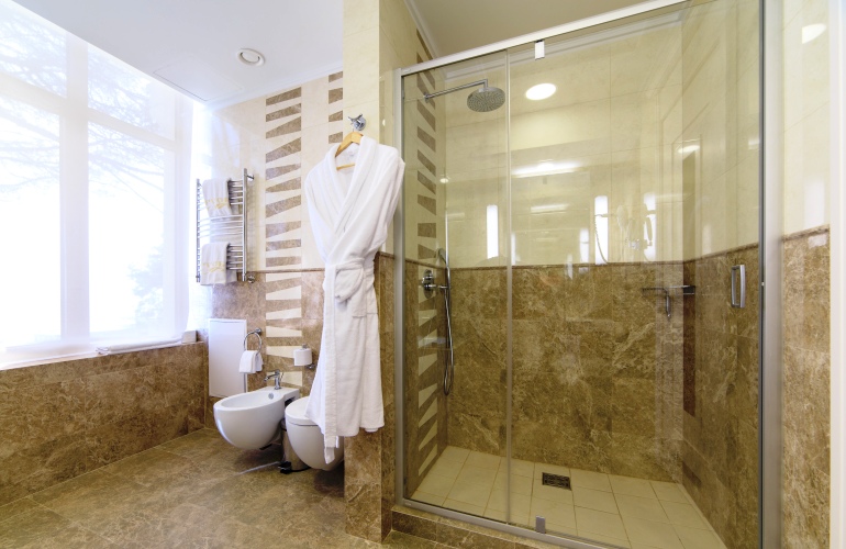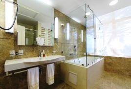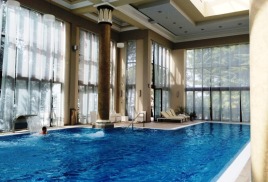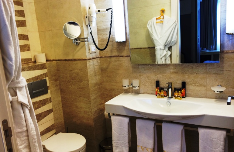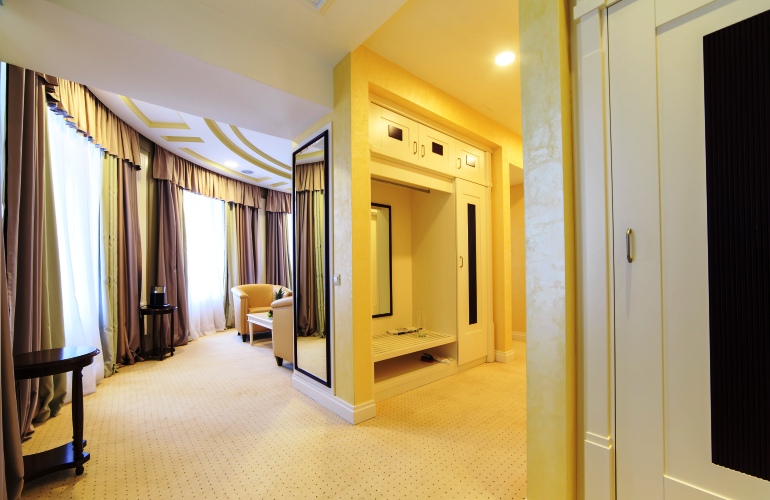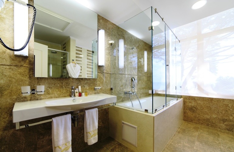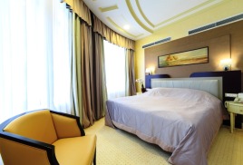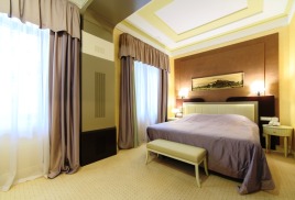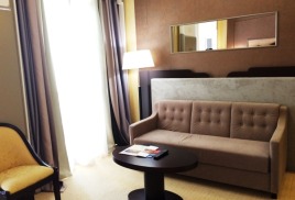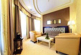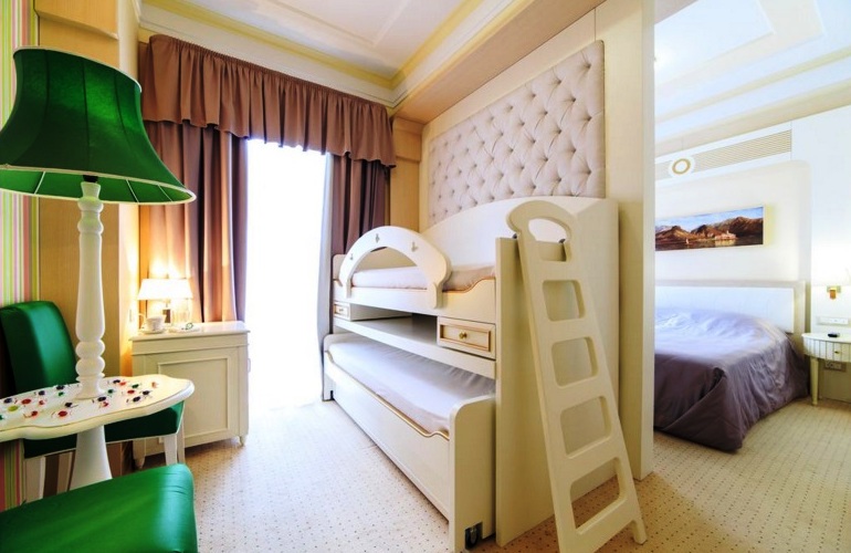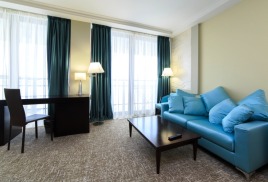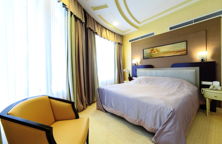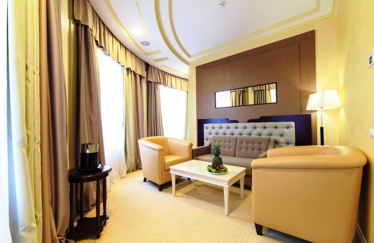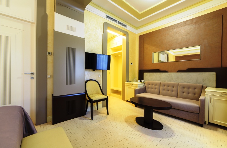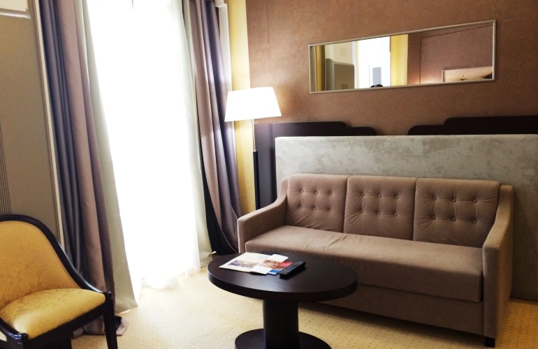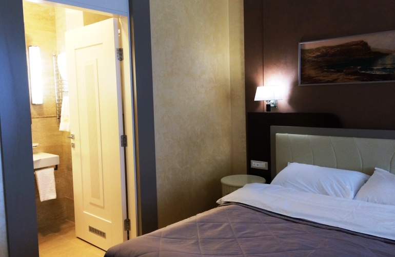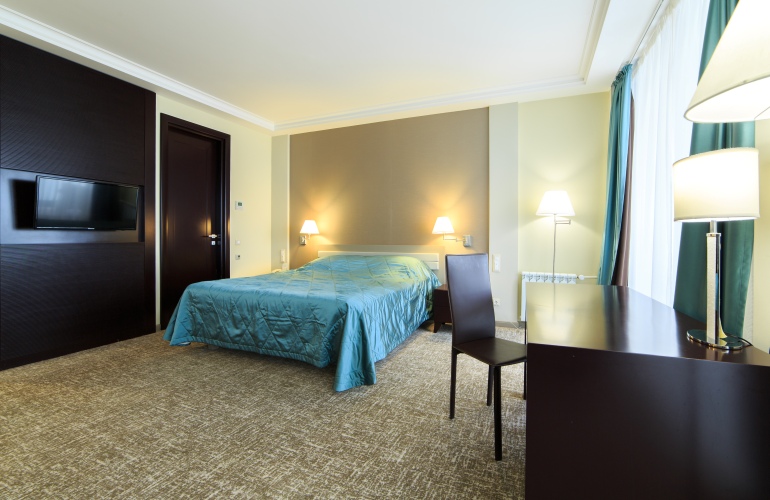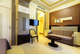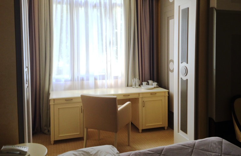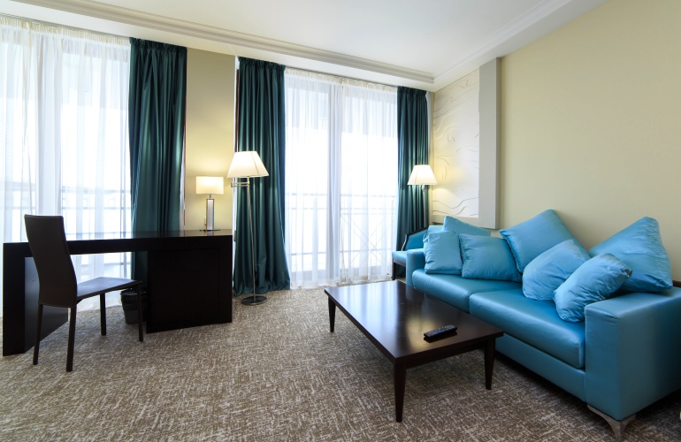 - 2-х местный номер "Джуниор Сьют": двуспальная кровать, раскладной двуспальный диван, санузел (душевая кабина, биде, фен, банные принадлежности и халаты, WC), кондиуционер, телевизор, телефон, сейф, мини холодильник, Wi-Fi. Балкон, вид на море через парк. Общая площадь 34-37.2 кв.м.