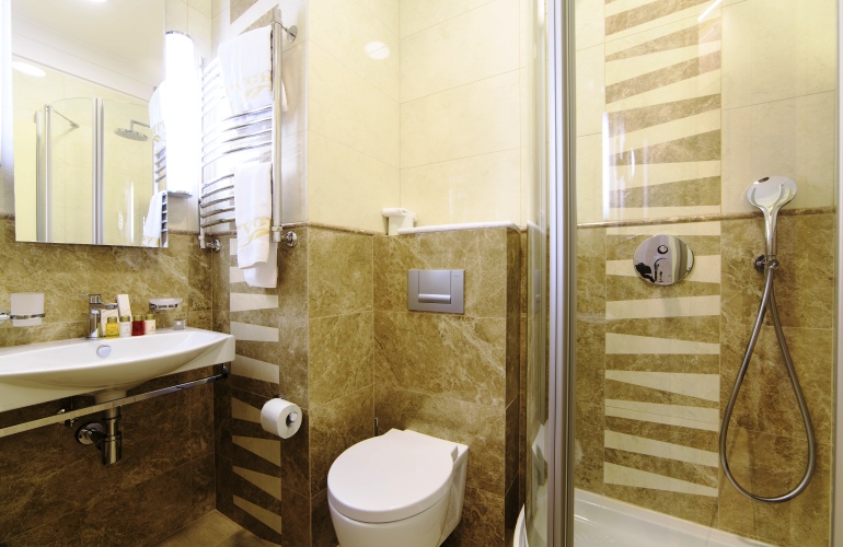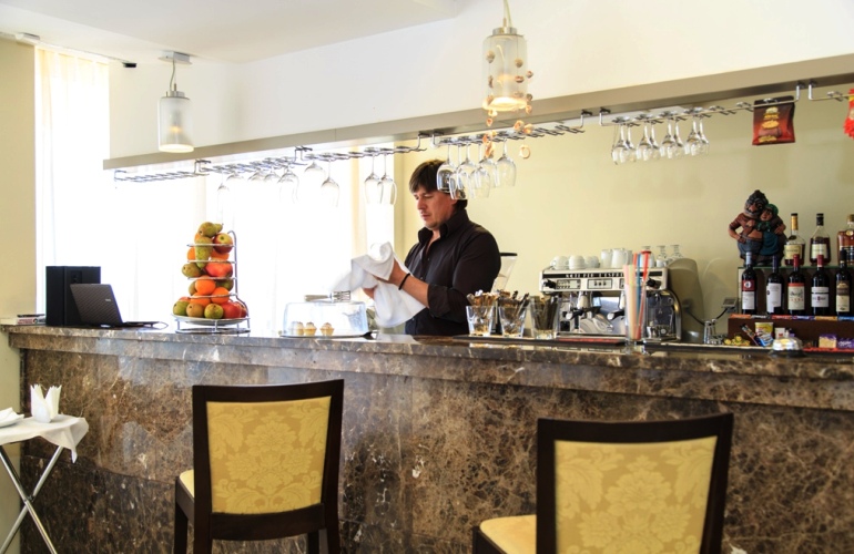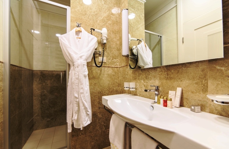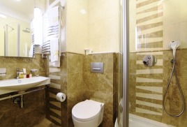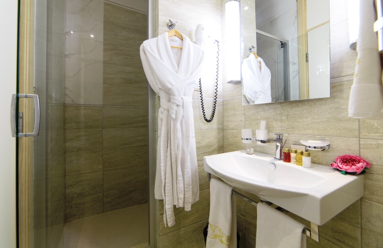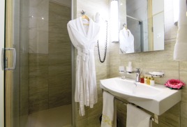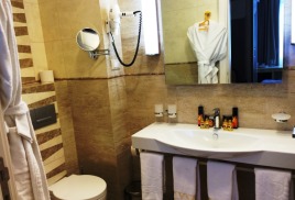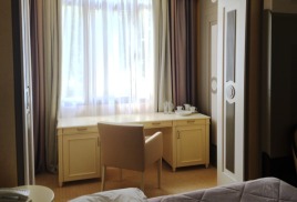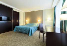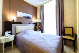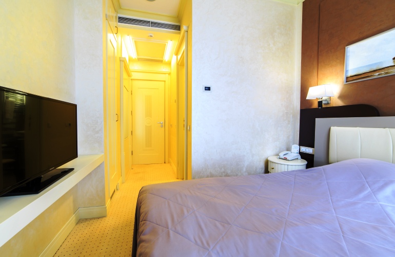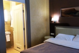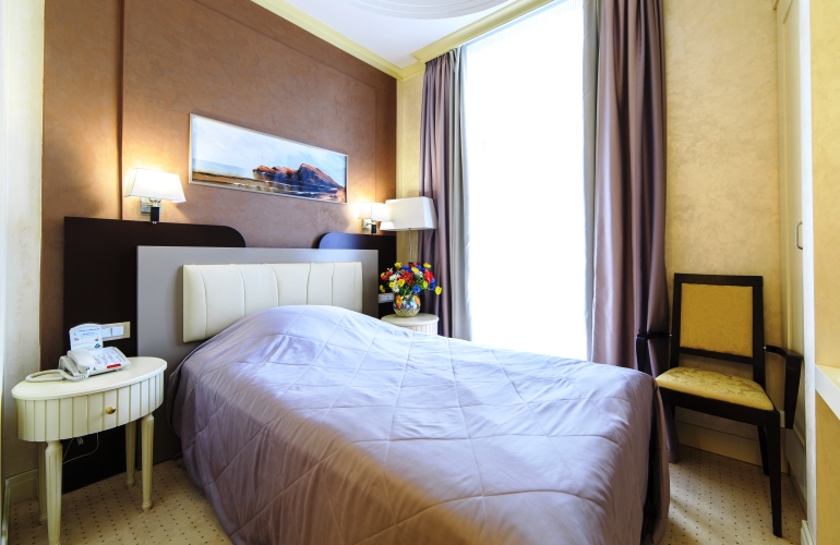 - 1-но местный номер: полутороспальная кровать, без доп. места, санузел (душевая кабина, фен, банные принадлежности, халат, WC), кондиционер, телевизор, телефон, сейф, мини холодильник, Wi-Fi. Балкона на 1-м этаже нет, номера на 2 и 3 эт. с балконами. Вид на внутренний дворик. Общая площадь 16 кв.м.
