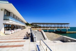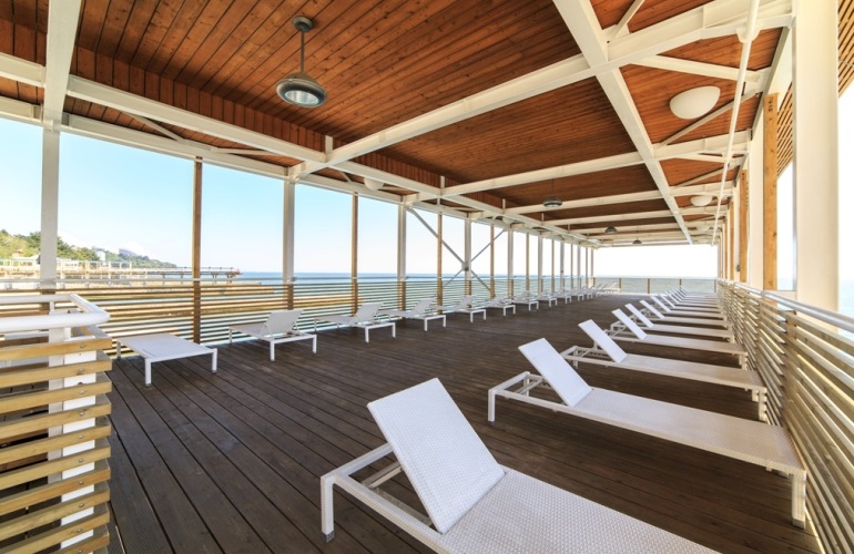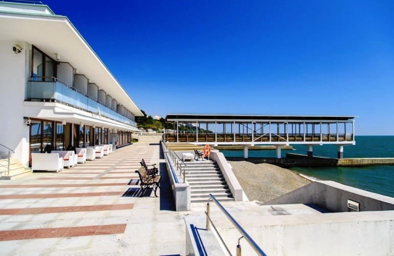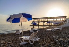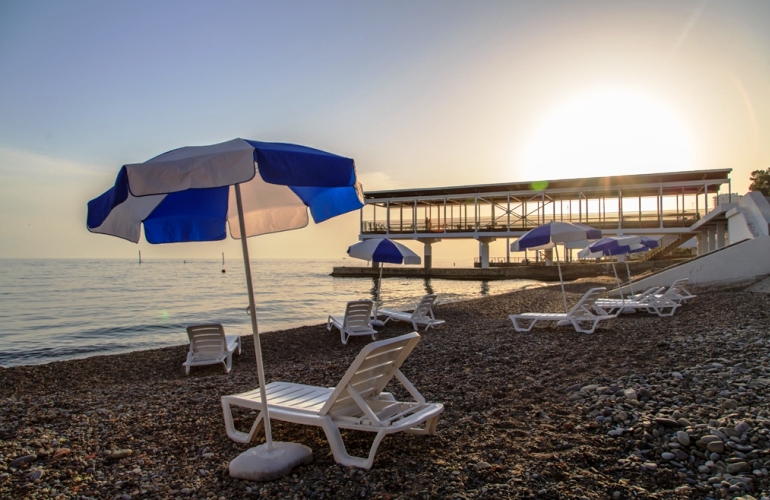 Пляж: собственный оборудованный мелкогалечный пляж, протяженностью 175 м (лежаки, теневые навесе, аэрарий).