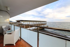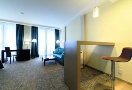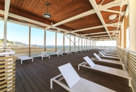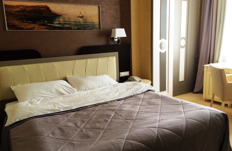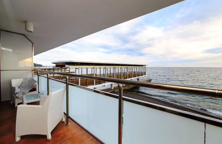 - 2-местный "Улучшенный Cтудия". Расположен в корпусе «Приморский», непосредственно на берегу моря. Просторный однокомнатный двухместный номер, одна двуспальная кровать, мягкий не раскладной диван 155 см. Барная стойка, мини-кухня, чайник. Санузел (душевая кабина, биде, фен, банные принадлежности, халаты, WC), кондиционер, телевизор, телефон, сейф, мини холодильник, Wi-Fi. Большой балкон-терраса с панорамным видом на море оборудован плетеной мебелью. Общая площадь 46.6 кв.м.
