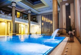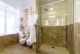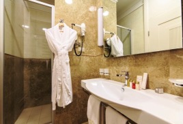 - 2-х местный номер "Дабл": двуспальная кровать, раскладной двуспальный диван, санузел (душевая кабина, фен, банные принадлежности, халаты, WC), кондиционер, телевизор, телефон, сейф, мини холодильник, Wi-Fi. Номера на 1-2 эт. без балконов, 3 этаж – с балконами. Вид на внутренний дворик с фонтаном и парк. Общая площадь 32 кв.м.