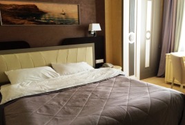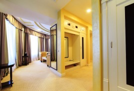 - 2-х местный 2-х комнатный номер "Люкс". Угловой, две смежные комнаты без дверей. Спальня, гостиная, большая прихожая. В одной комнате двуспальная кровать. Во второй комнате мягкий двуспальный раскладной диван. Полный санузел (ванна, душ, биде, фен, банные принадлежности и халаты, WC, гостевой санузел), кондиционер, телевизор, телефон, сейф, мини холодильник, Wi-Fi. Без балкона. Панорамный вид на парк и море. Общая площадь 52.4 кв.м.