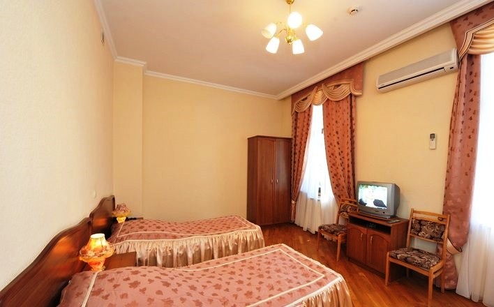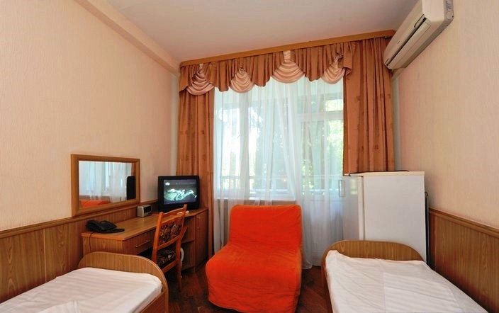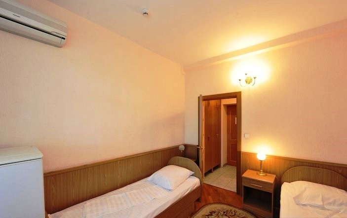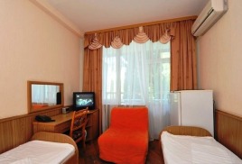 - 2-местный 1-комнатный стандартный (коэф. 0,74). 2-3 этаж. Площадь - от 20 кв.м. В номере: две односпальные кровати,дополнительное место -еврораскладушка, столик туалетный, стулья, шкаф, пляжные полотенца, радио, сплит-система, телевизор, телефон, холодильник, чайный набор посуды, электрочайник. Санузел с душем.