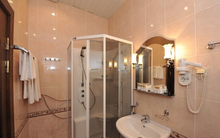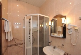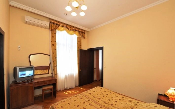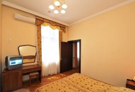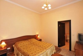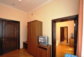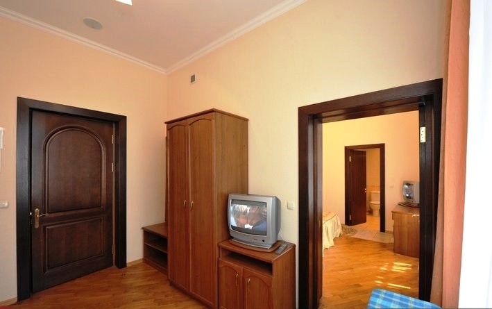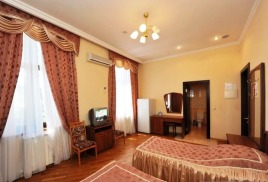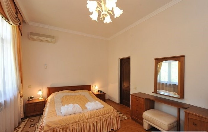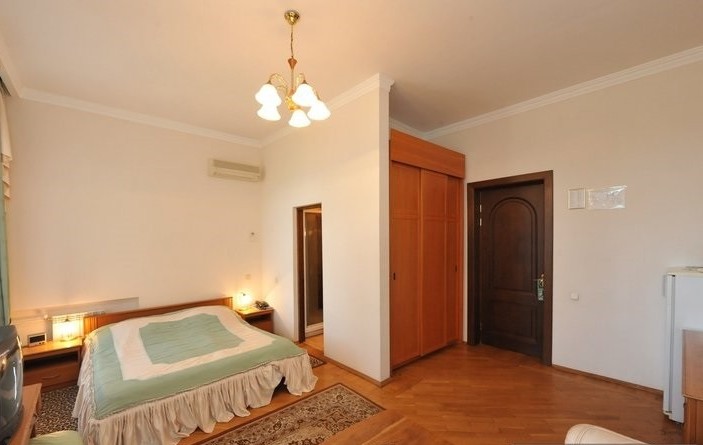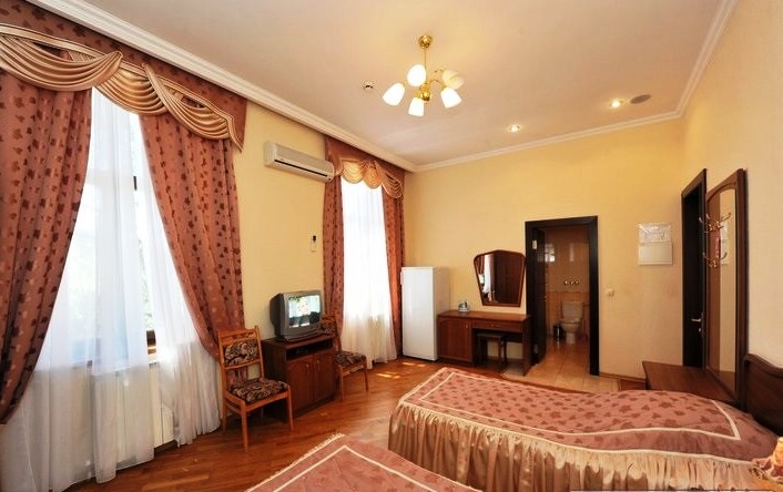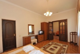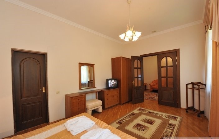 - 2-местный 2-комнатный люкс. 2-3 этаж. Площадь - от 30 кв.м. В номере: 2-х спальная кровать,дополнительное место -диван, столик туалетный, стулья, шкаф, пляжные полотенца, радио, сплит-система, телевизор, телефон, холодильник, чайный набор посуды, электрочайник, без балкона.Санузел с душем,также имеются туалетные принадлежности, тапочки, халат и фен.