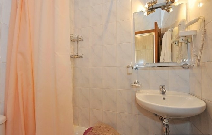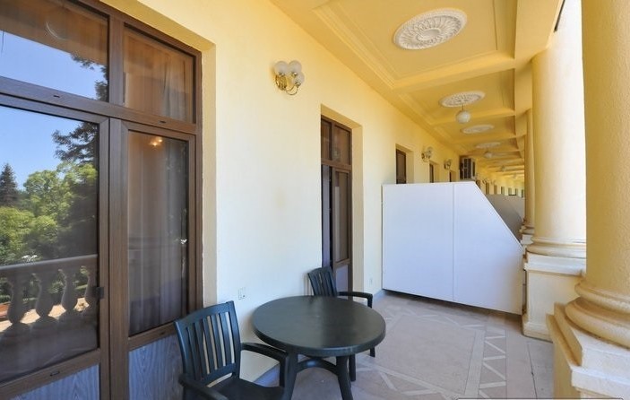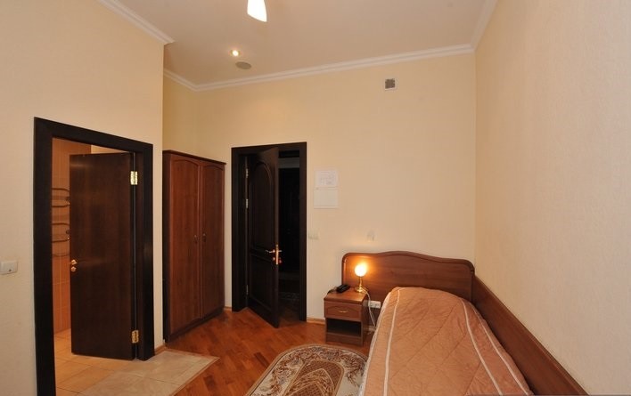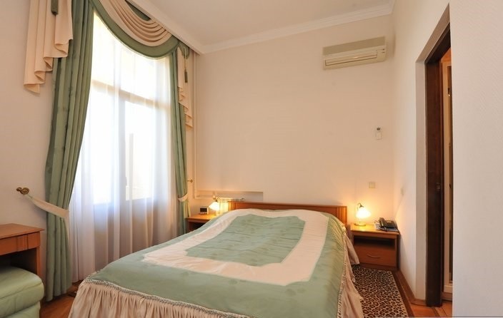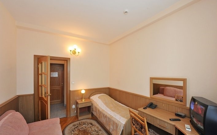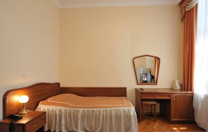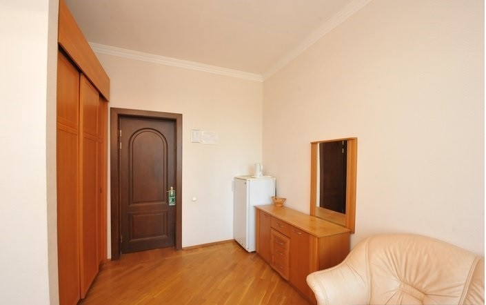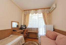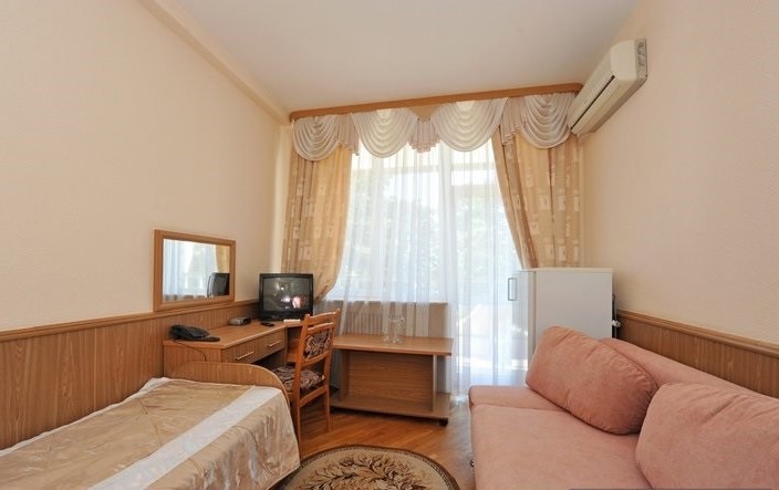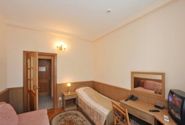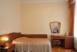 - 1-местный стандартный (коэф. 0,76). Вид на парк, этажи: 3, 6-8. Площадь - от 12 кв.м. В номере: односпальная кровать,дополнительное место -диван/еврораскладушка, столик туалетный, стулья, шкаф, пляжные полотенца, радио, сплит-система, телевизор, телефон, холодильник, чайный набор посуды, электрочайник. Санузел с душем. В некоторых номерах балкон.Номер с видом на парк.