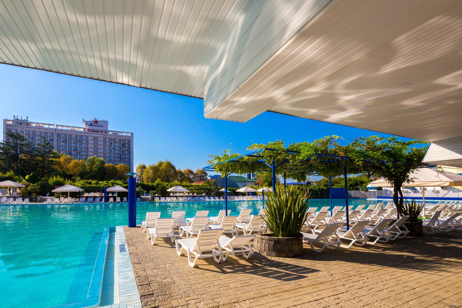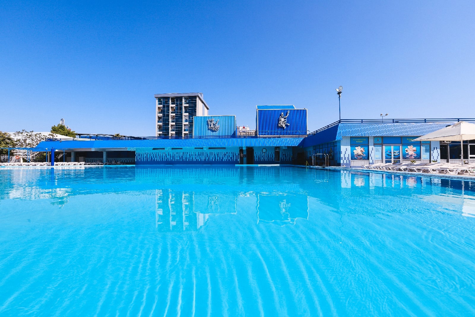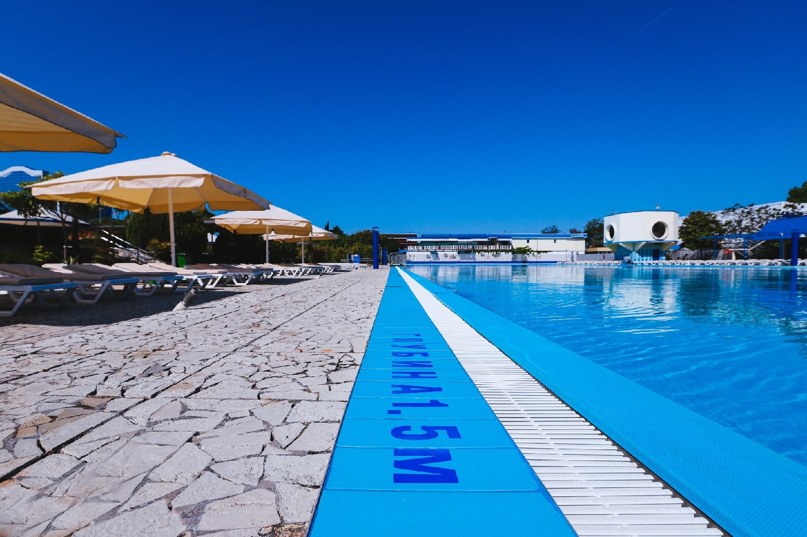 - открытый бассейн с морской водой подогреваемый (площадь зеркала воды = 3000 кв. м. Глубина – 1,45 м.Для самых маленьких имеется детская 2-х уровневая плескательница с горкой, глубиной 0,6 м, детский плавательный бассейн глубиной 0,9 м.) Работает круглогодично.