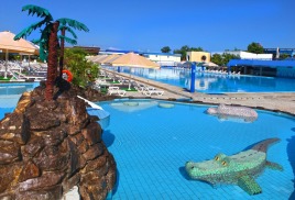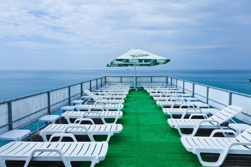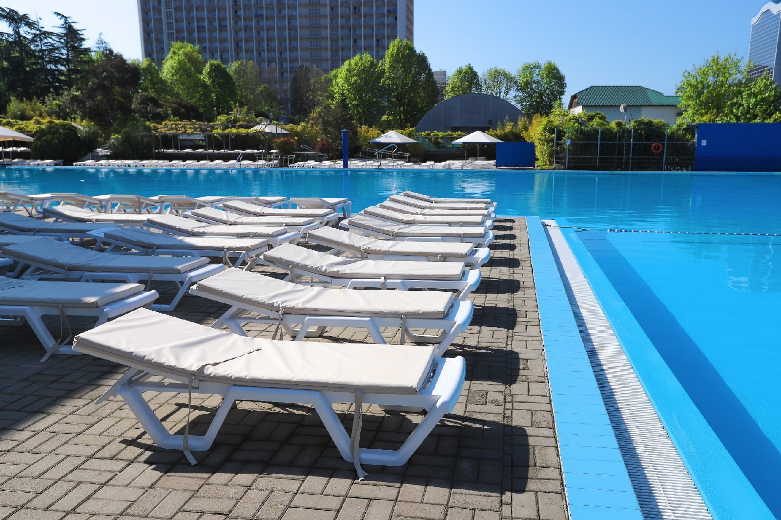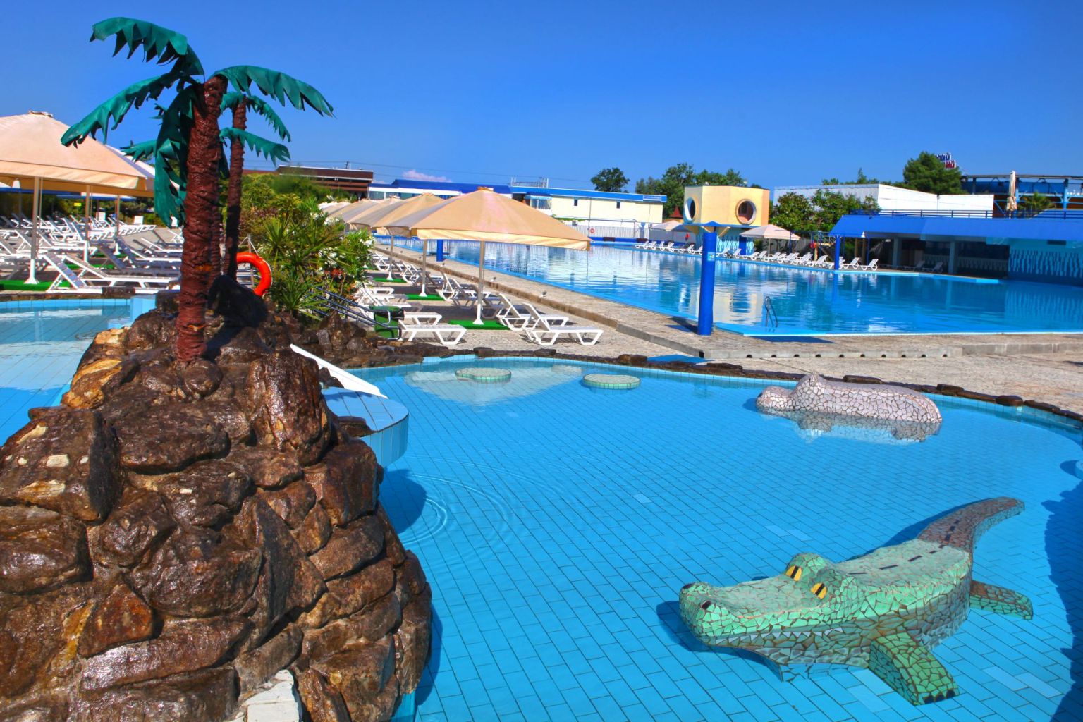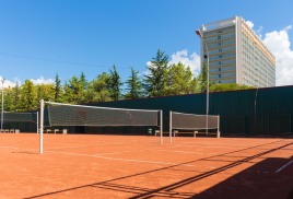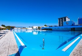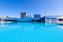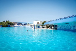- открытый бассейн с морской водой подогреваемый (площадь зеркала воды = 3000 кв. м. Глубина – 1,45 м.Для самых маленьких имеется детская 2-х уровневая плескательница с горкой, глубиной 0,6 м, детский плавательный бассейн глубиной 0,9 м.) Работает круглогодично.