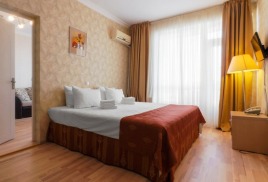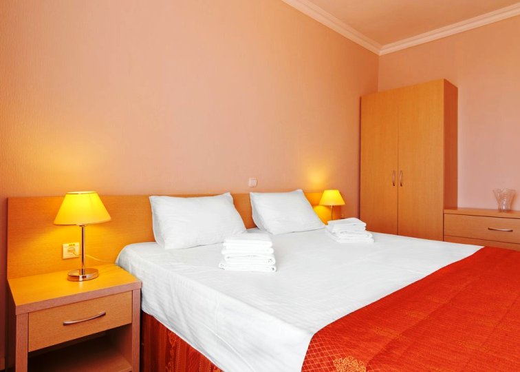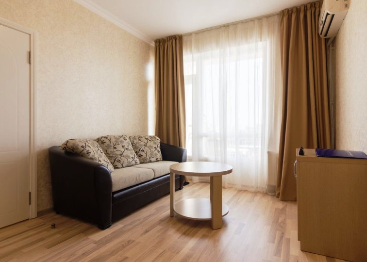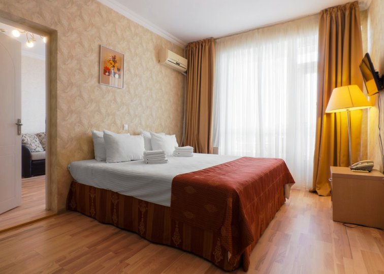 Двухкомнатный просторный комфортабельный номер, включающий в себя: отдельную спальную комнату со шкафом и гостиную с мягкой мебелью и рабочим местом. Теплая цветовая гамма интерьера и мягкая, удобная мебель. С балкона открывается прекрасная панорама на Черное море и парковую зону. Жилая площадь номера 32 кв.м.