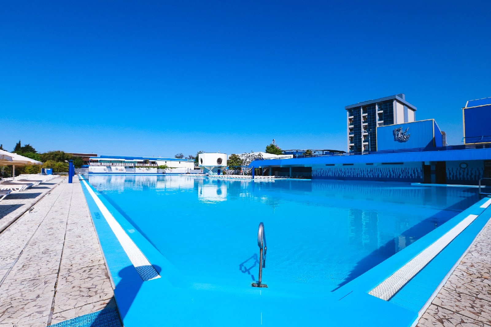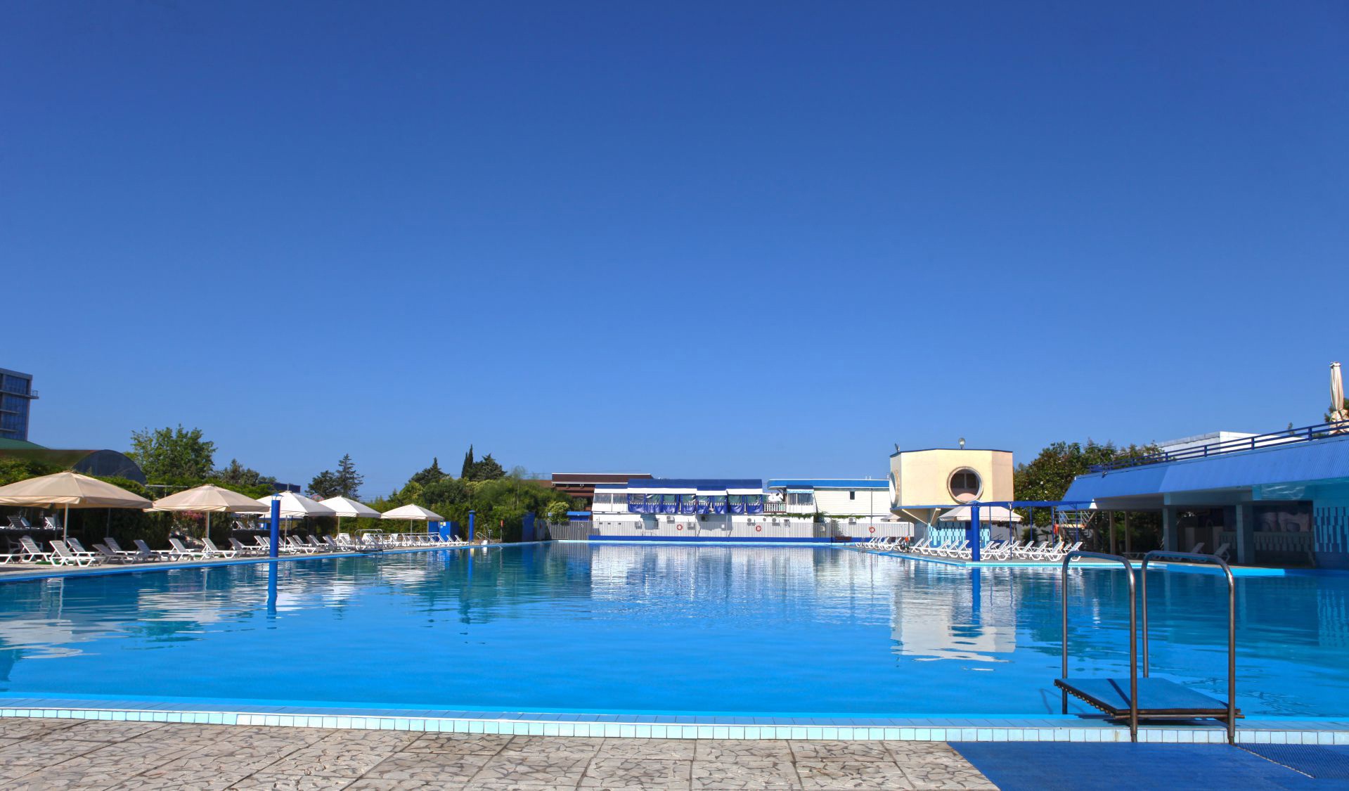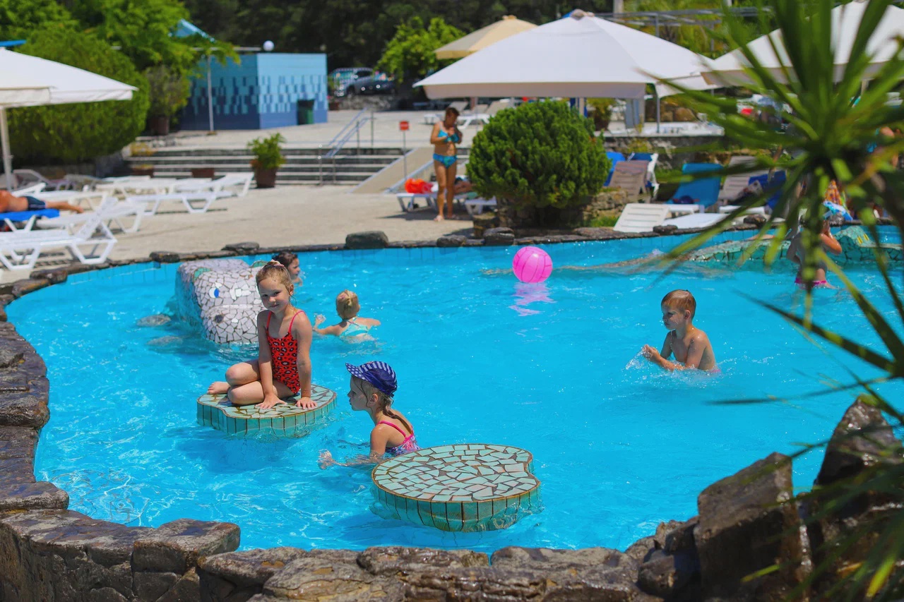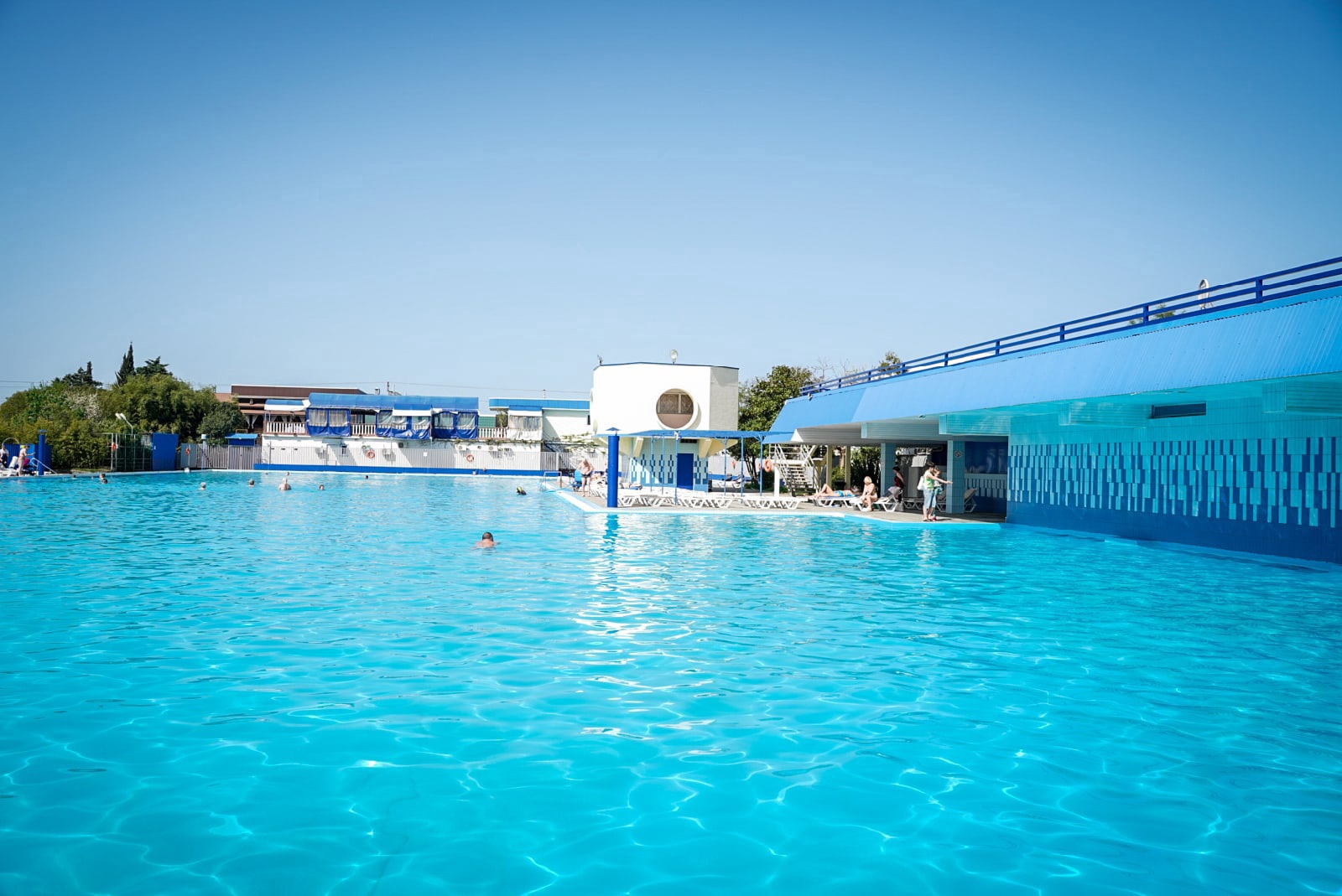 - открытый подогреваемый бассейн с морской водой (площадь зеркала воды = 3000 кв. м. Глубина – 1,45 м.Для самых маленьких имеется детская 2-х уровневая плескательница с горкой, глубиной 0,6 м, детский плавательный бассейн глубиной 0,9 м.). Работает круглогодично. Для комфортного отдыха на территории бассейна расположены душевые, санузел, медпункт, кафе, деревянные лежаки и теневые навесы. Режим работы бассейна с 9:00 до 19:00 без выходных.