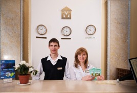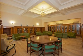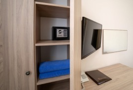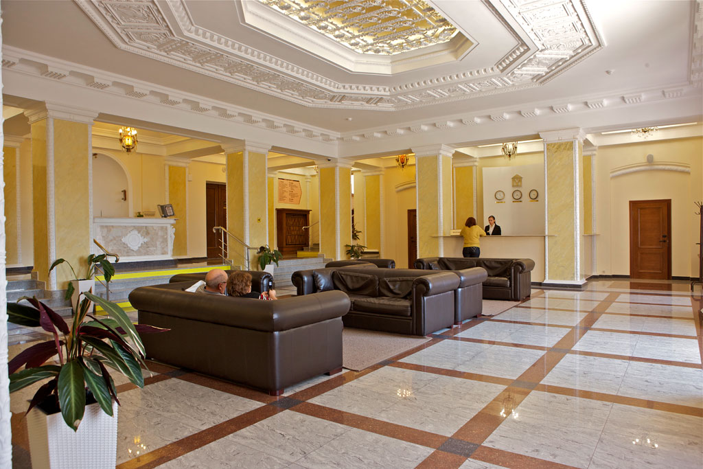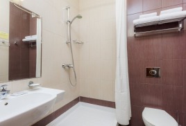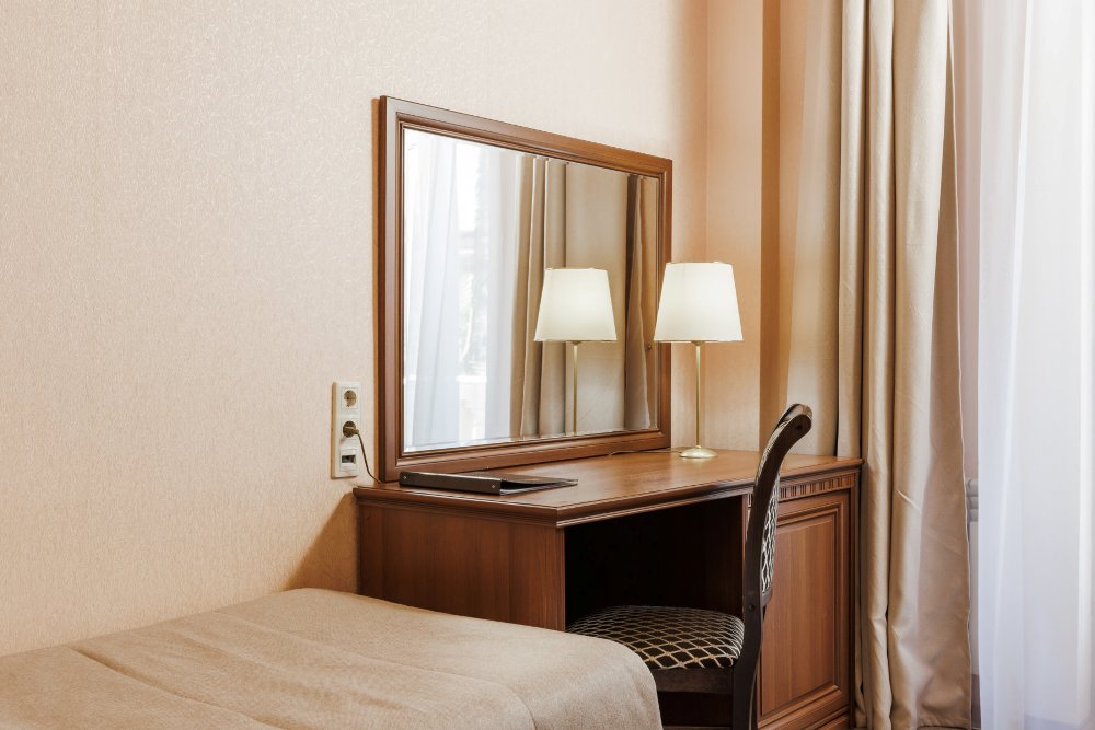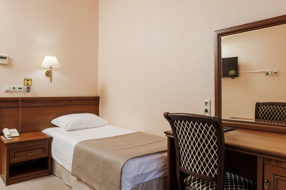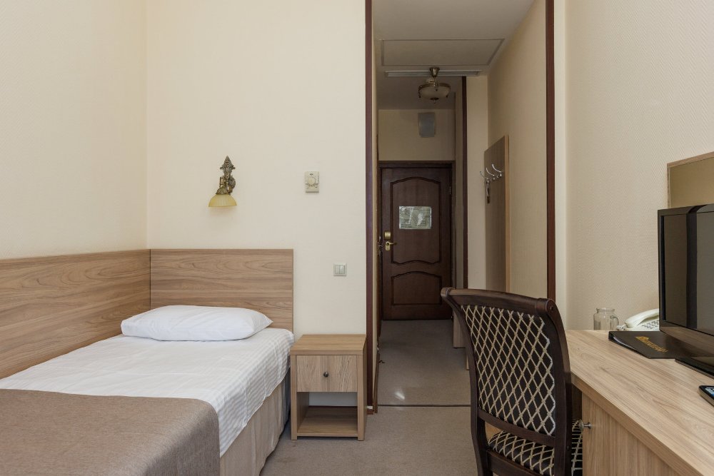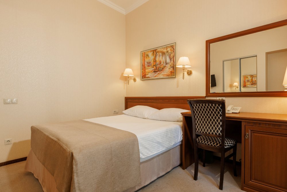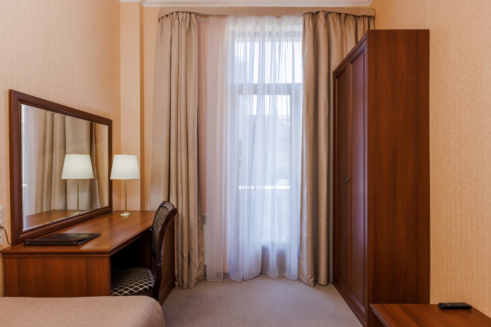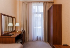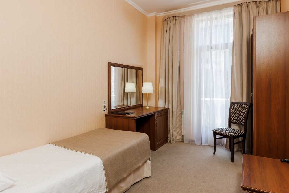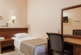 - 1-местный 1 категории. Однокомнатный номер с высоким потолком площадью 12-14 кв.м. В номере собственная ванная комната, односпальная кровать (размер 90Х200 см), шкаф, письменно-туалетный стол, тумбочка, телевизор, холодильник, система кондиционирования воздуха. Номера расположены в восточной части корпуса с видом на парк. Балкона в данной категории номера нет.