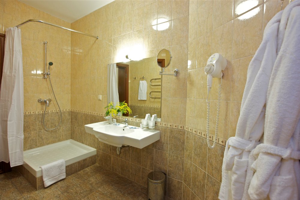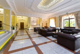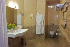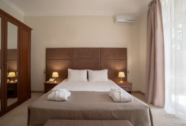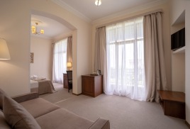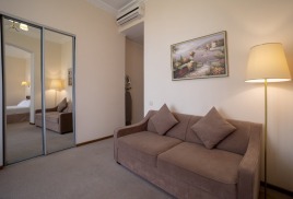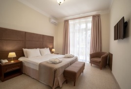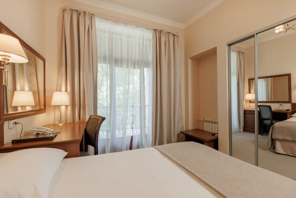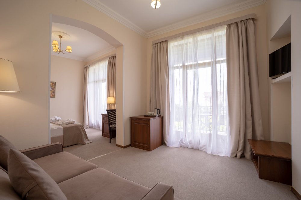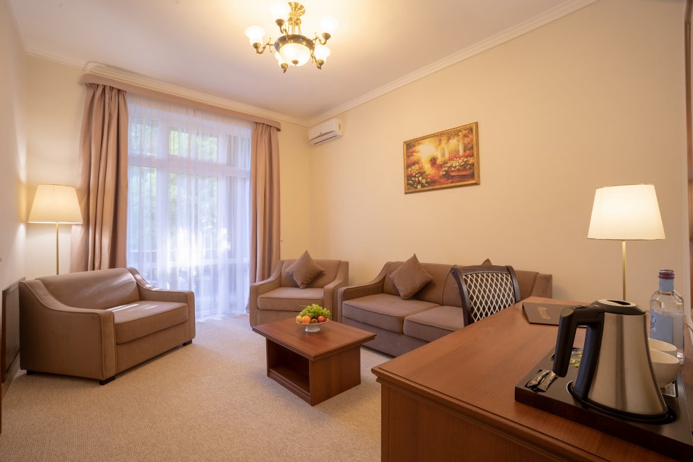 - Джуниор Сюит. Просторный номер с высокими потолками площадью 30 кв.м., состоящий из спальни с двуспальной кроватью (160Х200 см), прихожей, ванной комнаты и гостиной с мягкой мебелью. В каждом номере есть кондиционер, телевизор, фен. Номера с видом на вечнозеленый парк. Номер идеально подходит для семейного отдыха.