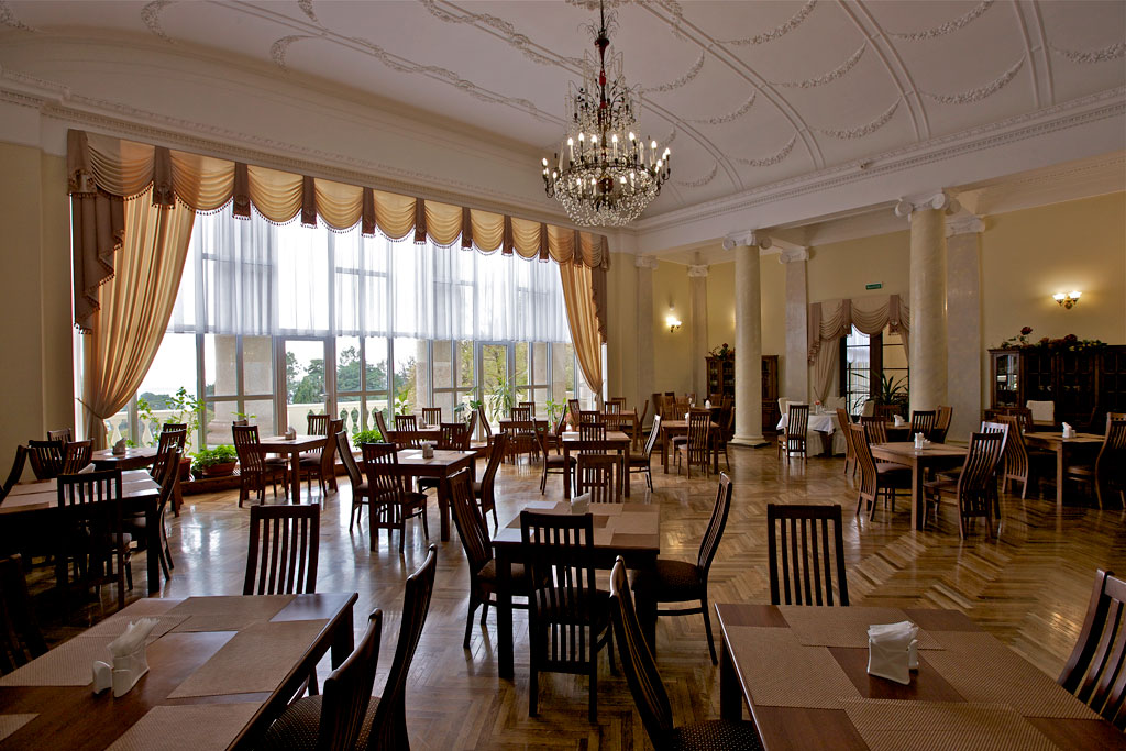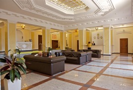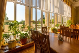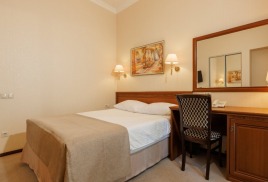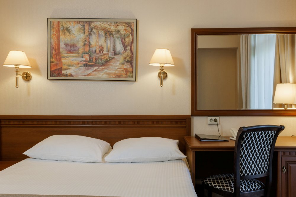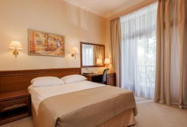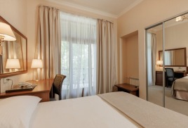 - 1-местный 1 категории комфорт. Однокомнатный номер с высоким потолком площадью 13-15 кв.м. В номере собственная ванная комната, односпальная кровать (размер 90Х200 см), шкаф, письменно-туалетный стол, тумбочка, телевизор, холодильник, система кондиционирования воздуха. В номере возможна установка дополнительного спального места (раскладное кресло). Номера расположены в центральной и западной части корпуса с видом на море или парк санатория.