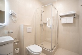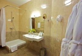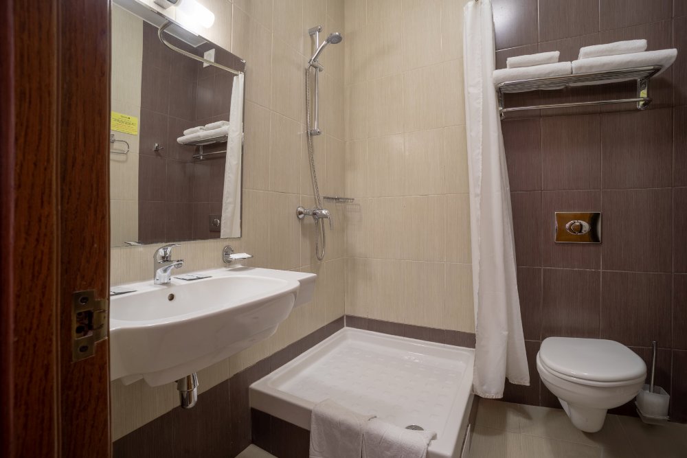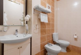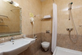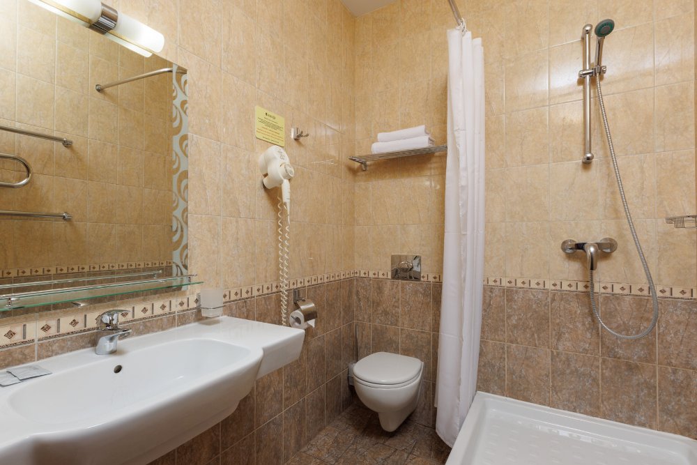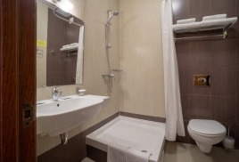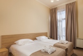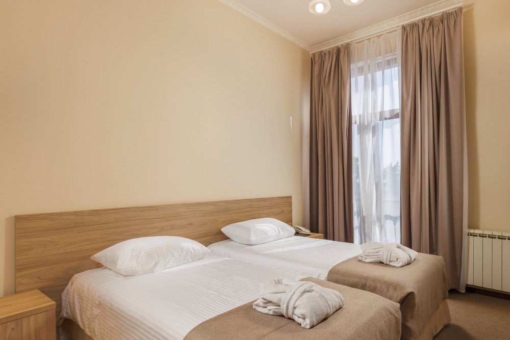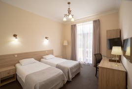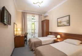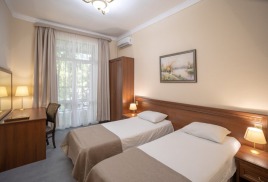 - 2-местный 1 категории комфорт. Однокомнатный номер с высоким потолком площадью 16-18 кв.м. В номере собственная ванная комната, две односпальные кровати (размер 90Х200 см), шкаф, письменно-туалетный стол, тумбочка, телевизор, холодильник, система кондиционирования воздуха. Возможна установка дополнительного спального места (раскладное кресло). Номера расположены в центральной и западной части корпуса с видом на море или парк санатория.