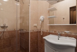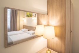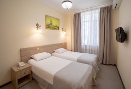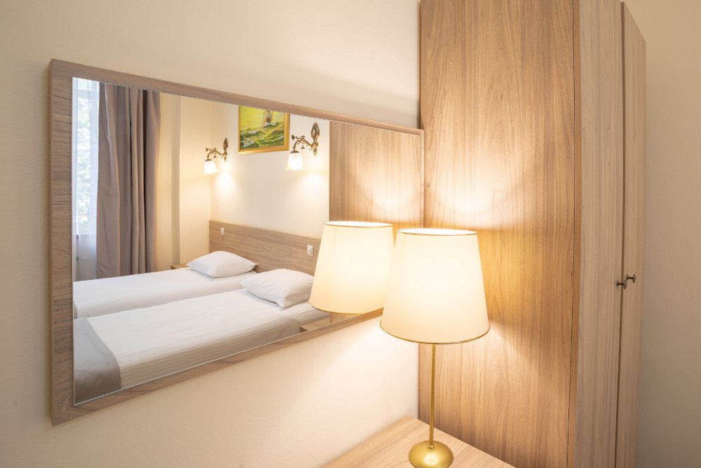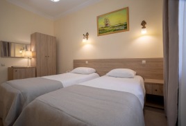 - 2-местный 1 категории. Однокомнатный номер с высоким потолком площадью 14-16 кв.м. В номере собственная ванная комната, 2 односпальные кровати (размер 90Х200 см), шкаф, письменно-туалетный стол, две тумбочки, сплит-система, холодильник, телевизор. Номера расположены в восточной части корпуса с видом на парк. Балкона в данной категории номера нет.