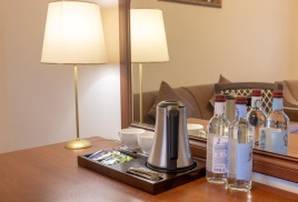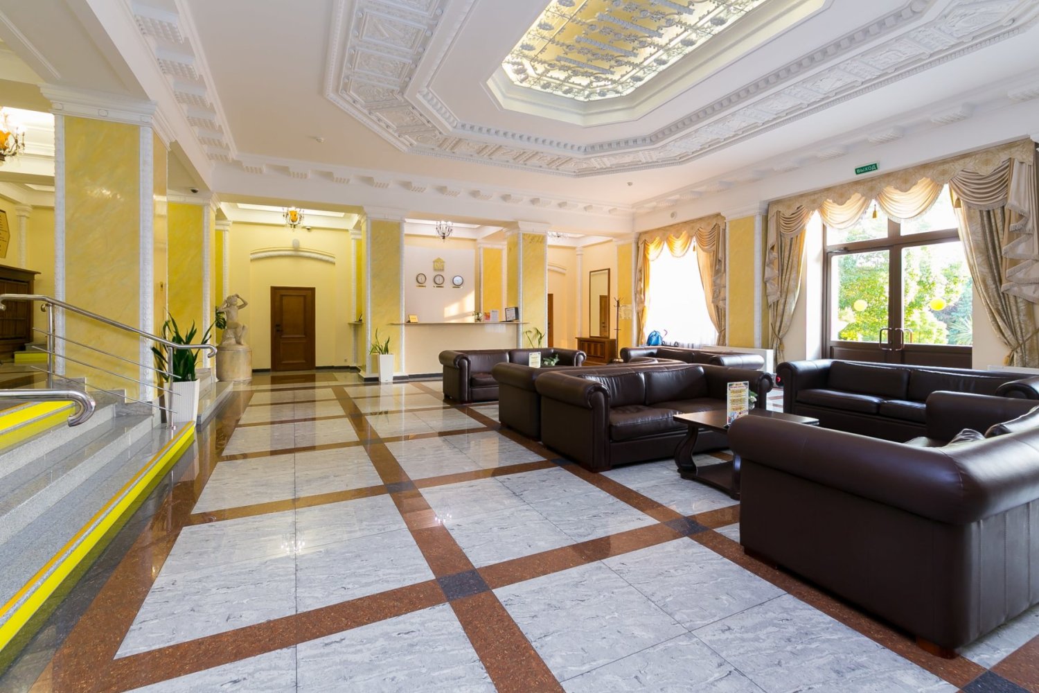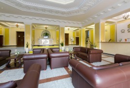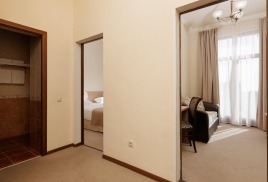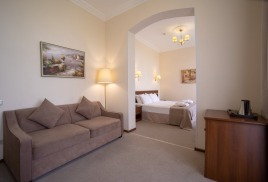 - «Люкс» двухместный двухкомнатный. Площадь номера – 45 кв.м. Две просторные и изолированные друг от друга комнаты с высокими потолками — спальня с двуспальной кроватью (160Х200 см) и гостиная, оборудованные мягкой мебелью, необходимыми бытовыми принадлежностями и сейфом.